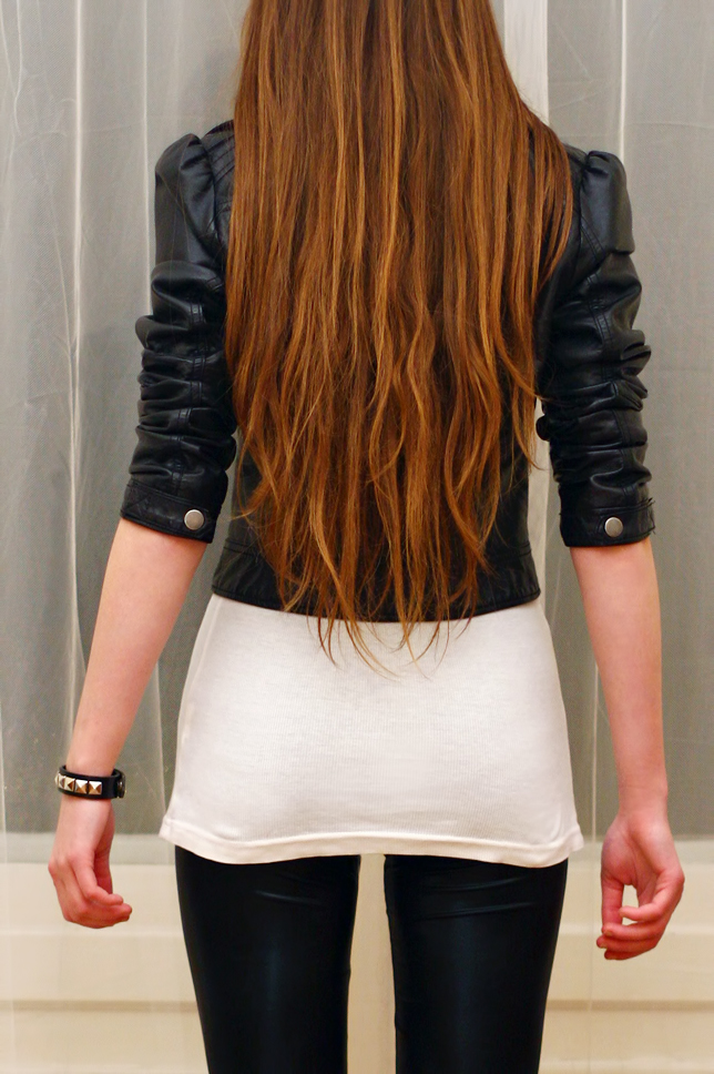 Dziś kolejna stylizacja ze "skórzanymi" (lub też jak niektórzy wolą "błyszczącymi" legginsami) oraz białym długim topem. Jak już pisałam, nawet tego typu kontrowersyjny ciuch mający wielu przeciwników nie będzie wyglądał źle w odpowiednim zestawieniu. Tym razem połączyłam je ze skórzaną kurtką, czarnymi czółenkami, dużymi kolczykami w kształcie kół i czarną bransoletką z ćwiekami. Jak Wam się podoba efekt?