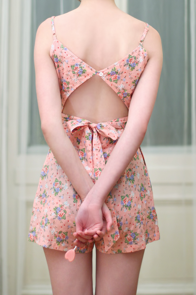 No i znów efekt tęsknoty za latem :) Tym razem bardzo dziewczęcy, wręcz "cukierkowy". Dziś przedstawiam Wam kombinezon w kolorze pastelowego różu, który kupiłam latem. Urzekł mnie wzór w delikatne kwiaty oraz oryginalny fason - szczególnie odkryte plecy i kokardka z tyłu. Całość kojarzy mi się z filmem Lolita (1997), który zresztą uwielbiam! Jeśli go oglądaliście to z pewnością pamiętacie kostiumy głównej bohaterki, które były utrzymane w podobnym stylu.
