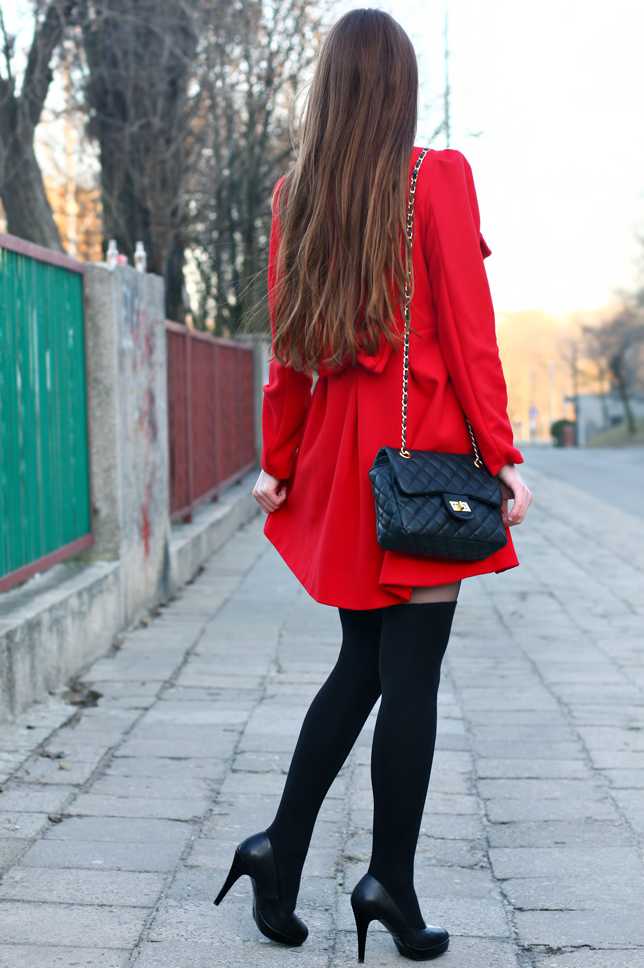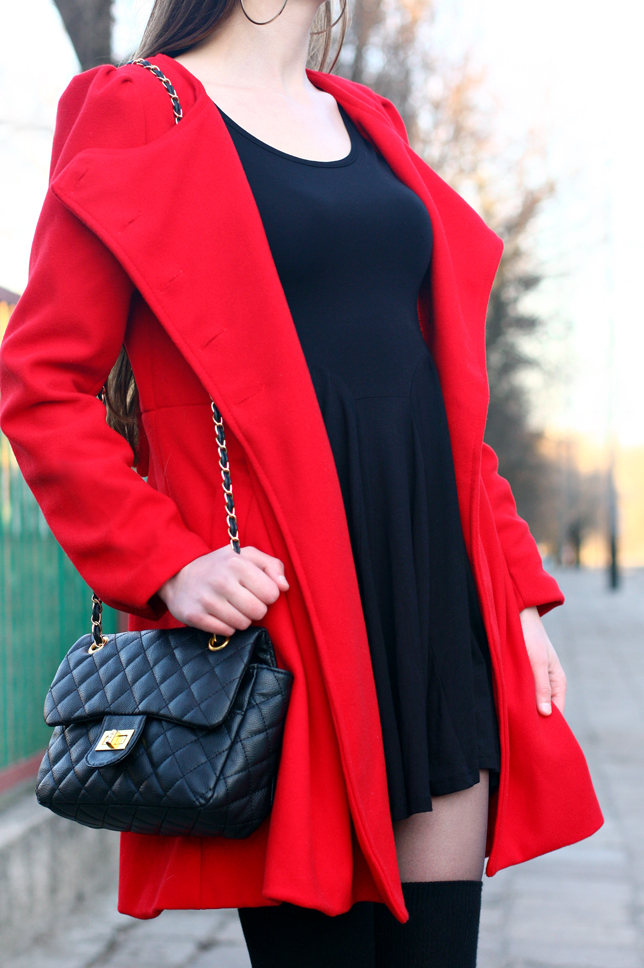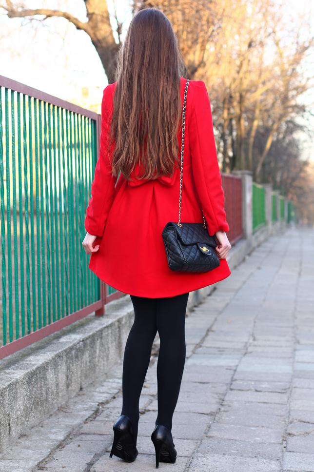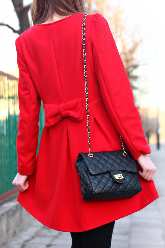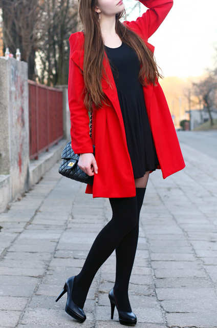 Dzisiejsza stylizacja z pewnością pomogła ożywić ponury zimowy krajobraz ;) Soczysta czerwień bez wątpienia wyróżnia się na tle czarnych i szarych ubrań innych osób. Płaszcz, który Wam dziś prezentuję, oprócz nietypowego koloru, posiada z tyłu uroczą kokardkę. Sprawia ona, że strój od razu nabiera dziewczęcego charakteru ;) Pod spód postanowiłam założyć czarną krótką sukienkę - nowy nabytek ze sklepu Asos. Do tego dobrałam zestaw składający się z cienkich ciemnych rajstop, czarnych zakolanówek oraz klasycznych czółenek. Nie zabrałko także czarnej pikowanej torebki na złotym łańcuszku - mam nadzieję, że jeszcze się Wam nie znudziła? ;) Uważam, że jest dość uniwersalna i świetnie pasuje do wielu rzeczy.