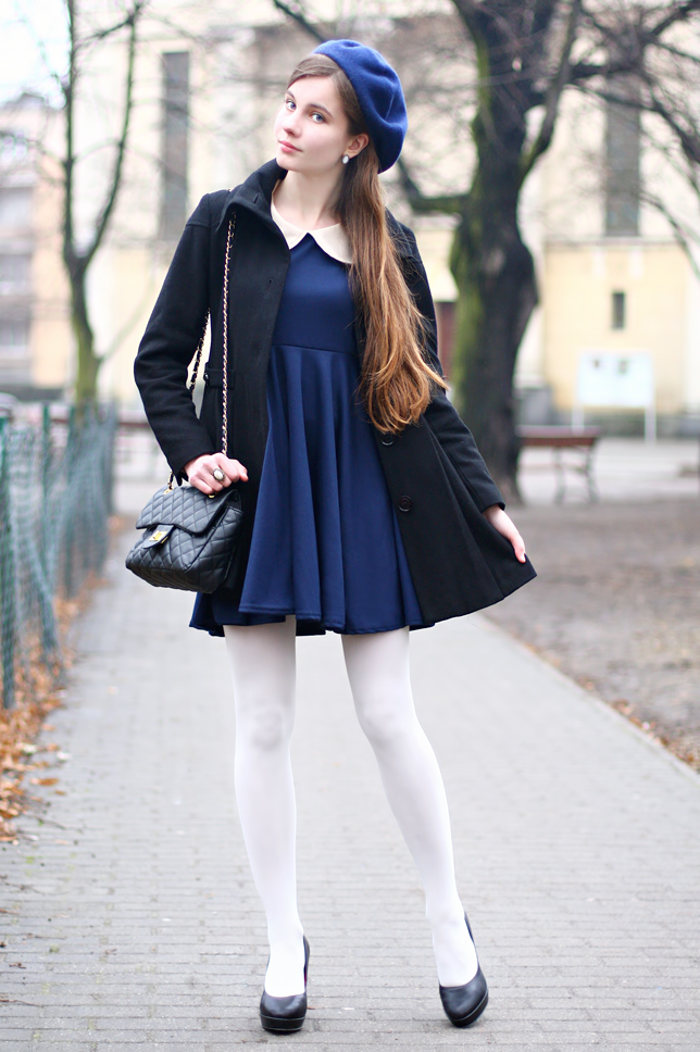 I showed you my new navy-blue dress with white collar not long ago. A lot of people liked it very much, so I'd decided to prepare a new look with it. This time it is in winter version. To the garments that I was wearing lately (navy-blue french beret, white tights, quilted bag, black pumps), I also add black winter coat. As you see, only one element could change remarkably the wholeness. Which version do you prefer?