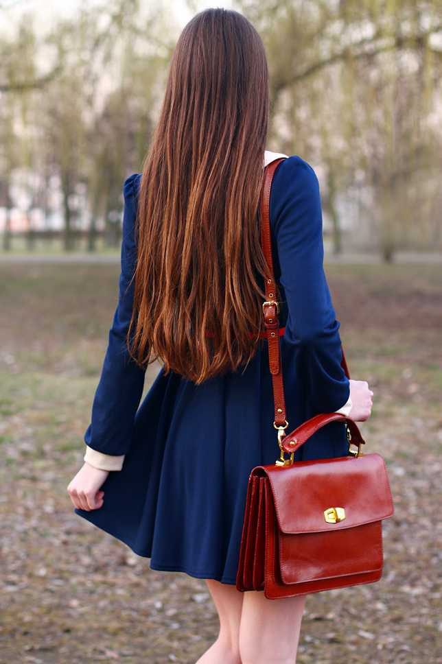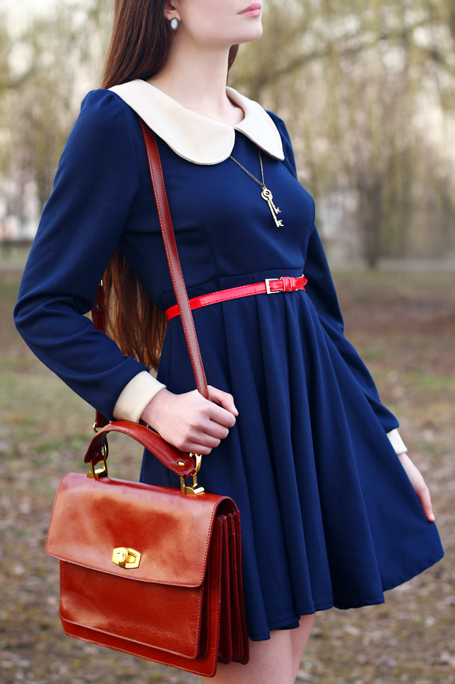 Dość niedawno (jeszcze zimą) pokazywałam Wam stylizację z granatową sukienką z białym kołnierzykiem (tzw. peter pan collar) ze sklepu Arafeel.com . W końcu nadeszła długo oczekiwana wiosna - postanowiłam więc wybrać się kilka dni temu na spacer do parku. Uznałam, że założenie owej sukienki będzie dobrym wyborem, szczególnie że pogoda była wyjątkowo piękna :) Tym razem postanowiłam połączyć ją z czerwienią, która ożywiła całą stylizację. Talię podkreśliłam paskiem, a do tego dodałam czółenka w podobnym kolorze. Wzięłam ze sobą także skórzaną brązową aktówkę, a na szyi powiesiłam oryginalny naszyjnik z zawieszkami w kształcie kluczy.