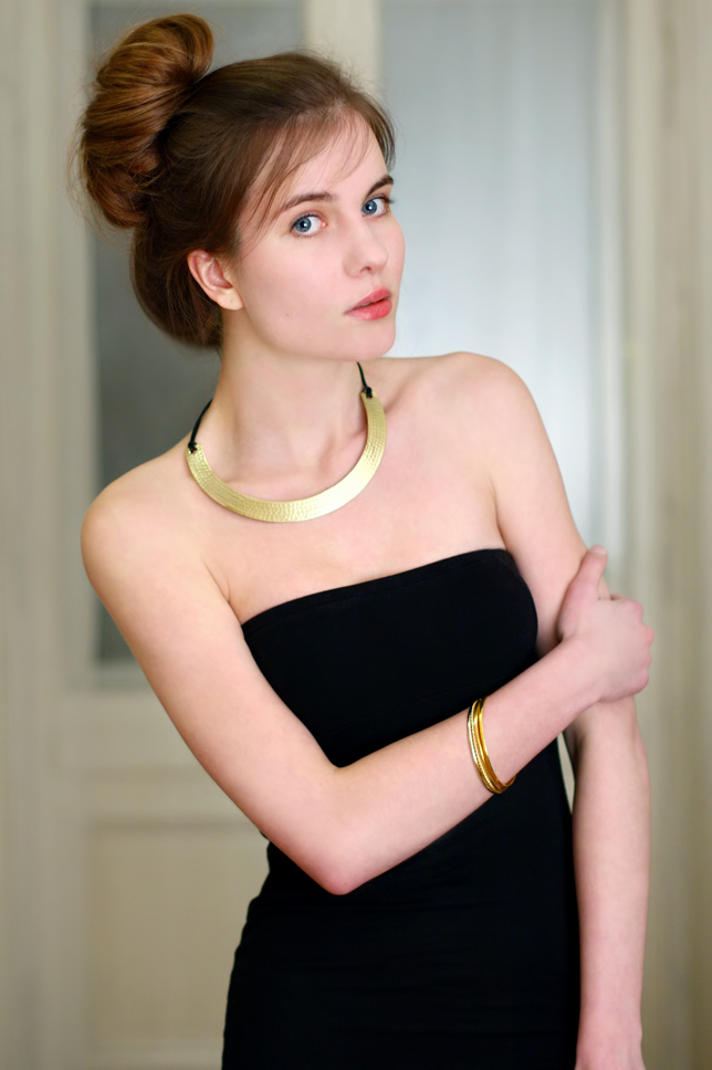 Little black is one of the things that is absolutely 'must have' for every woman. Today I am going to show you mine. I use the little black dress to create basic but very impressive look. I choosed tight, smooth dress with no shoulder straps. It makes the neck and shoulders looks great. I decided to add also black pumps and my new round necklace and some bracelets - all jewelry in gold. As you see, I've been experimenting on my hair - I made a big and a little bit slack bun ;) How do you like it?
