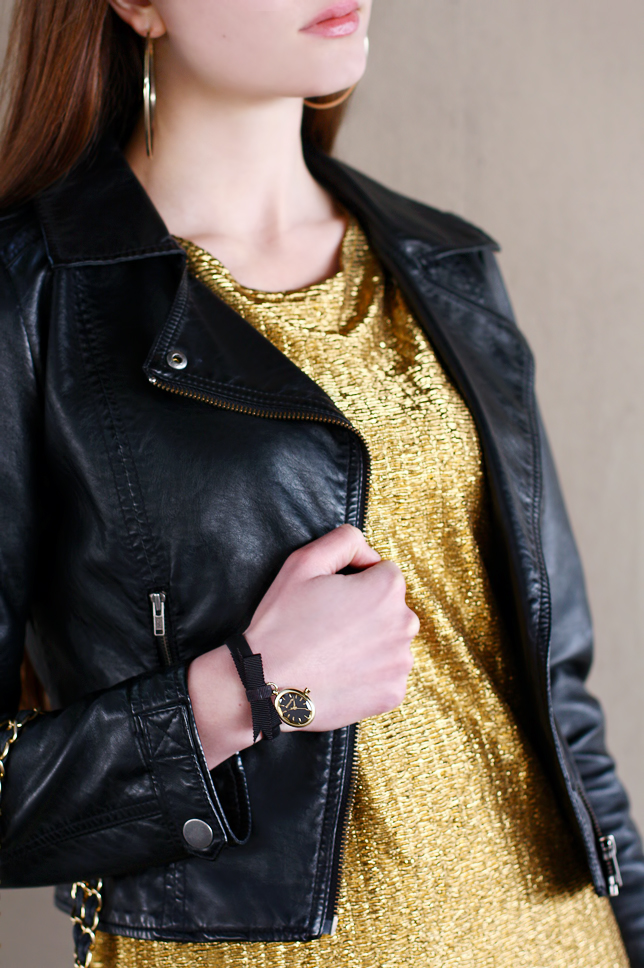 Jakiś czas temu urzekły mnie ubrania wykonane z metalicznych materiałów. Polowałam między innymi na złoty sweter marki H&M - niestety okazało się, że został szybko wyprzedany we wszystkich sklepach, które odwiedziłam... Postanowiłam więc poszukać czegoś podobnego w sieci. Na stronie Romwe.com znalazłam dość luźną bluzkę wykonaną z niemal identycznego materiału <link>. Postanowiłam zaryzykować i ją zamówić. Okazało się, że można ją nosić nie tylko jako tunikę, ale także sweter (po podwinięciu dołu) oraz krótką sukienkę! To duży atut umożliwiający stworzenie wielu różnorodnych stylizacji z jej udziałem :) Mimo wszystko dobranie do niej odpowiednich dodatków nie było zbyt łatwe - złoto w nadmiarze często prezentuje się kiczowato, a ja chciałam uniknąć takiego efektu. Uznałam, że czarna ramoneska założona na wierzch doda stylizacji ostrzejszego charakteru. Do tego założyłam także cienkie czarne rajstopy, klasyczne czółenka oraz dodatki - okrągłe kolczyki, pikowaną torebkę i delikatny zegarek z kokardką.