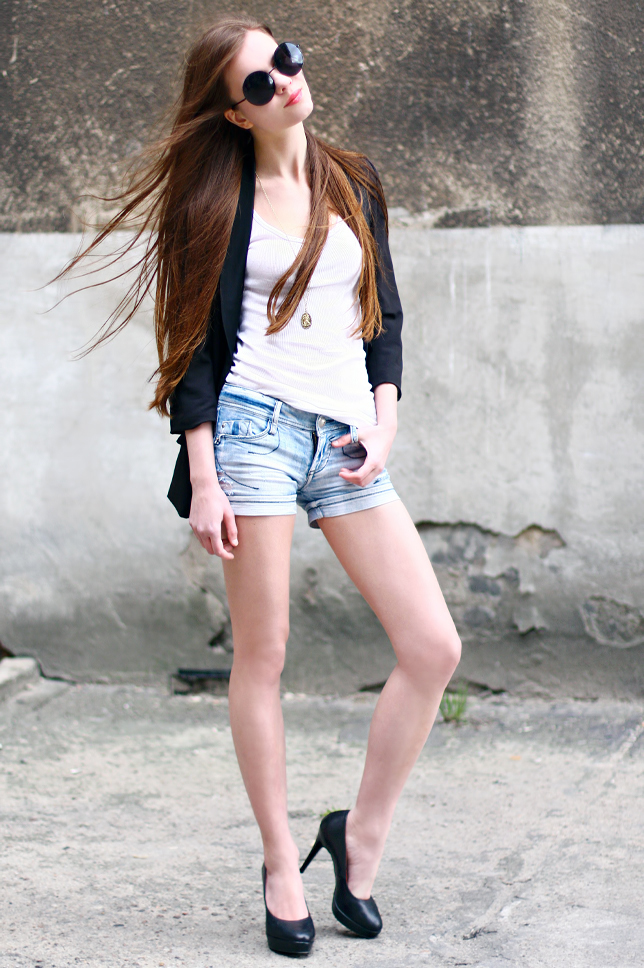 Today's outfit is in little different style than usually. I've been thinking about this arrangement for a long time, but couldn't set about prepare it earlier. The base is composed of three popular elements. All of them are surely in most of your wardrobes: loose black blazer from Tally Weijl, white vest and bright jeans shorts. So the blend is rather simple and it is easy to get inspiration to prepare it many times the same way. To this outfit I've matched high-heeled black shoes; thank to them everything looks more feminine and elegant (but I think that a ordinary sneakers should be great too). Ok, now it's time for accessories! I decided to hang on my neck the long gold necklace with oval locket and large black sunglasses - you can find them <here>. I newly became a lucky owner of them!