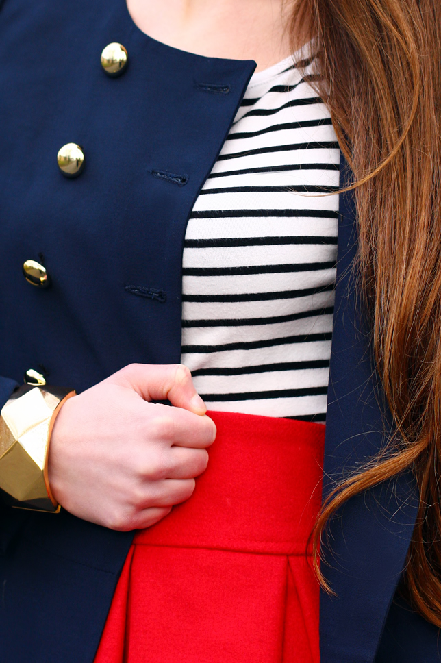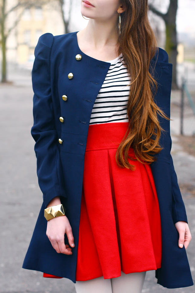 Tworząc dzisiejszy strój, kolejny raz inspirowałam się stylem marynarskim - zarówno pod względem kolorów jak i wzorów :) Tym razem mam na sobie bluzkę w biało-czarne paski oraz czerwoną rozkloszowaną spódniczkę z wysokim stanem marki Asos, którą kupiłam jakiś czas temu w sklepie Oasap.com. Z racji, że nie jest zbyt ciepło, zdecydowałam się założyć także białe rajstopy oraz granatowy płaszczyk ozdobiony złotymi guzikami. Do tego dołożyłam czerwone czółenka oraz złotą biżuterię - masywna bransoletkę oraz duże okrągłe kolczyki. Jak Wam się podoba? :)