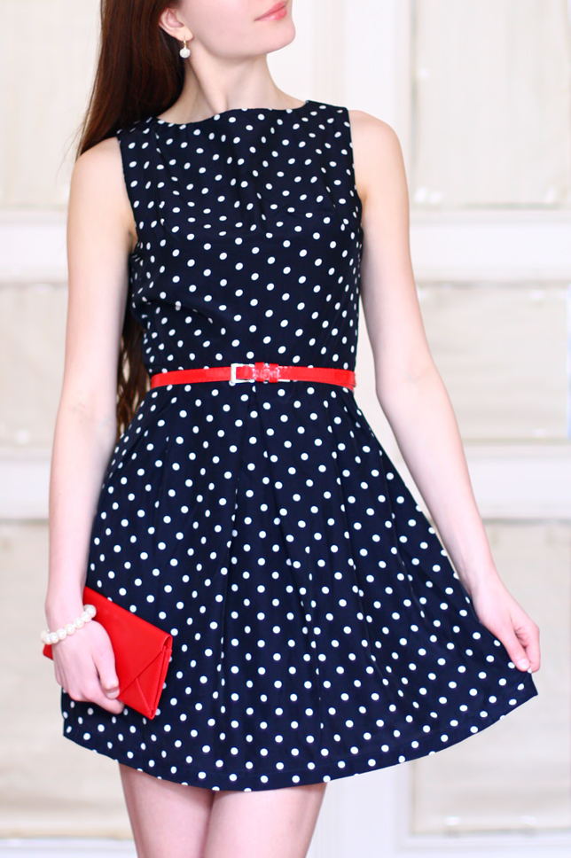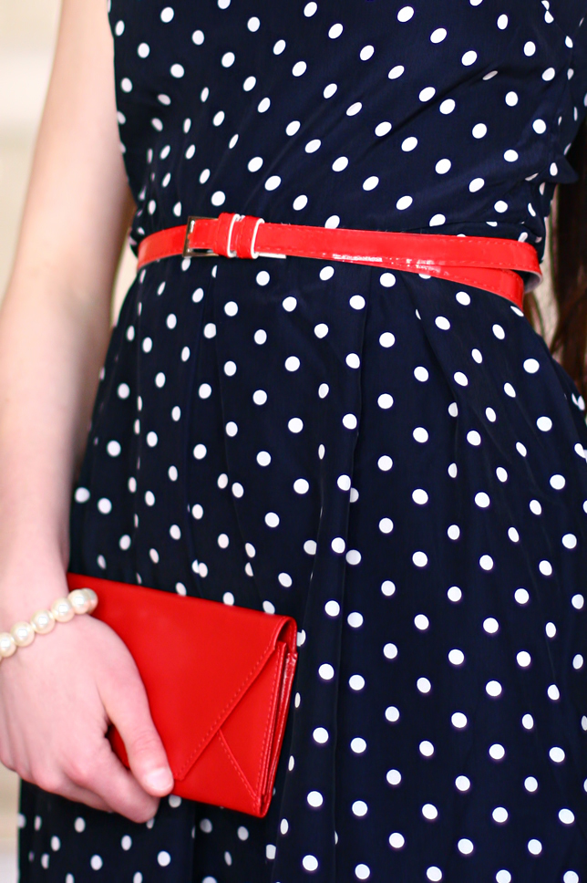 Tworząc dzisiejszą stylizację inspirowałam się trochę stylem pin-up, który zresztą od dawna bardzo lubię ;) Bazę stroju stanowi granatowa krótka sukienka w białe kropki marki AX Paris (<link>), która bez wątpienia jest bardzo kobieca i elegancka. Talię postanowiłam podkreślić czerwonym paskiem, który świetnie zgrał się z kolorem kreacji. Zdecydowałam się także na czółenka w tym samym kolorze, delikatną perłową biżuterię oraz małą kopertówkę, którą kupiłam niedawno na zagranicznym portalu aukcyjnym. Całość prezentuje się niczym wyjęta z dawnych lat :) Podoba się Wam taki styl?