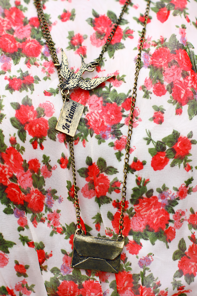 Korzystając z chwilowej poprawy pogody, wybrałam się wczoraj do parku aby móc w końcu zaprezentować Wam już jakiś czas temu nabytą na eBay sukienkę w kwiaty. Zawsze lubiłam tego typu wzory - są bardzo dziewczęce i urocze :) Dobrałam do niej delikatne jasne czółenka oraz naszyjnik z nietypowymi zawieszkami przedstawiającymi jaskółkę oraz kopertę. Kupiłam go dość dawno temu na zagranicznym portalu aukcyjnym. Wiem, że trochę zlewa się on z materiałem sukienki, ale mimo to uznałam, że w przybliżeniu tworzy z nią całkiem ładną kompozycję.