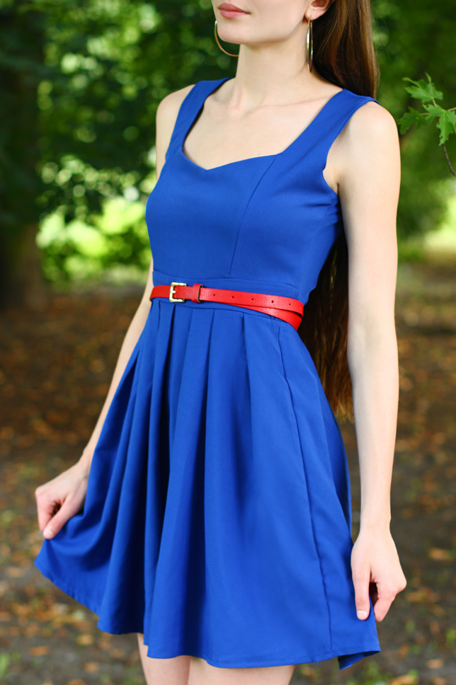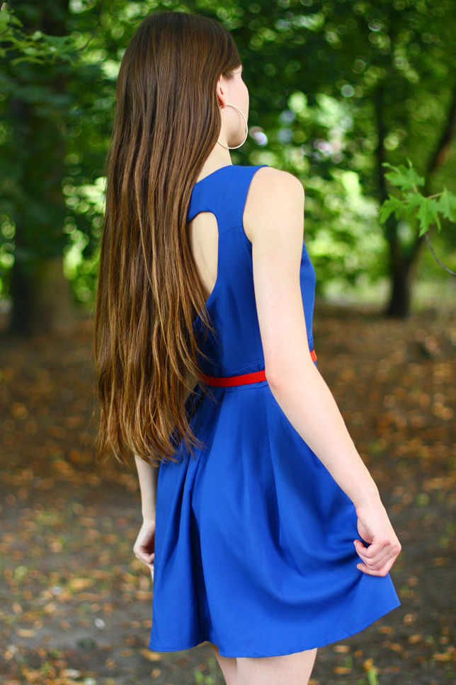 Recently I fell in love with clothes with the original heart-shaped cut on back. It looks very girly and cute! :) My first dress of this type is from Romwe.com. It was available in several colors - Finally I chose the navy blue because I don't have many clothes of such color. To revive the outfit, I added red accessories: leather pumps and a belt.