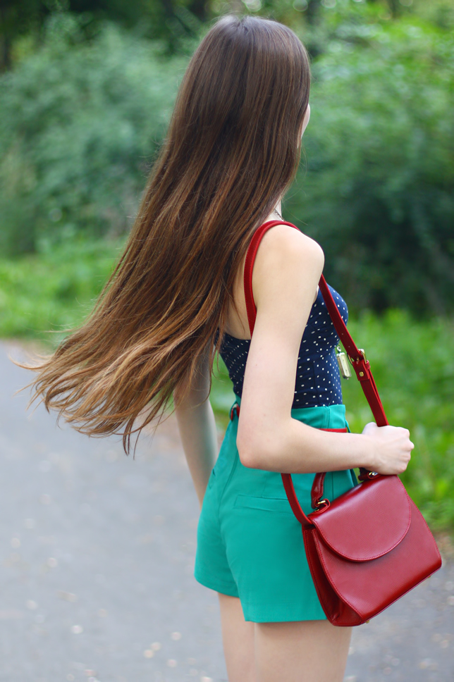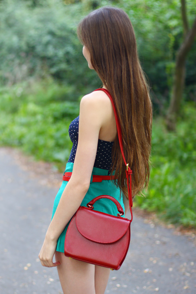 Lately I was searching my wardrobe for something perfect for hot days. Eventually, I have found a navy body with white spots, that I bought quite long ago in a Pull & Bear shop. In this outfit I have set it up with green high-waisted shorts (the same as <here>). Red belt, that was included, with no doubts was in need of choosing any other accessories in the same colour - so I think that puting on a classical red pumps and a retro leather bag from Romwe apears to be a good choice. Of course, I haven't forgotten about other accsessories - in that role you can see a pair of my new necklaces from L.O.L.A. I felt in love with them at first sight! I really like unusual watches - double-faced one looks absolutely original and gives 'something special' to the wholeness.