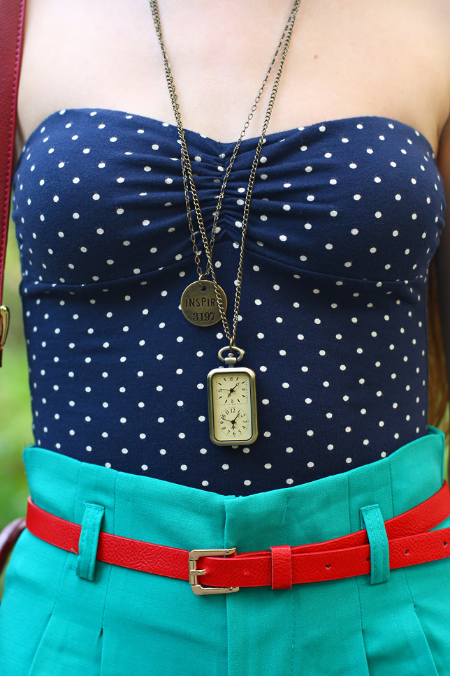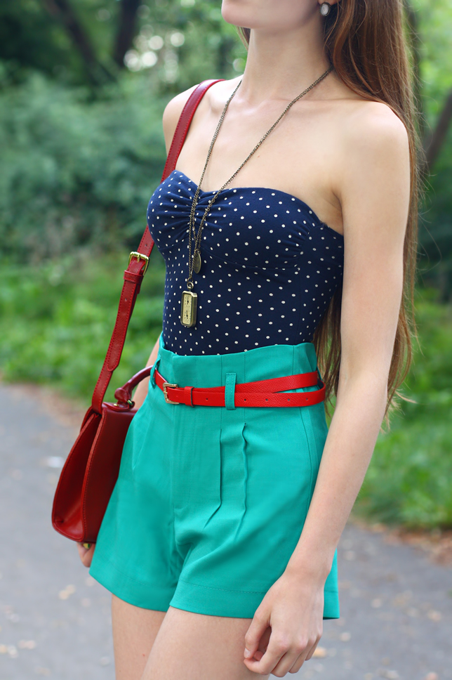 Ostatnio szukałam w szafie czegoś idealnego na upały - w końcu wygrzebałam z niej granatowe body w białe kropki, które kupiłam dość dawno temu w sklepie Pull & Bear. Zestawiłam je z zielonymi szortami z wysokim stanem - identyczne znajdziecie <tutaj>. Czerwony pasek, który był do nich dołączony bez wątpienia wymagał towarzystwa dodatków o takim samym kolorze - założenie klasycznych czółenek i skórzanej torebki w stylu retro okazało się więc strzałem w dziesiątkę ;) Oczywiście nie zapomniałam też o dodatkach - w tej roli zobaczycie dziś mój nowy naszyjnikowy duet. Zakochałam się w nim od pierwszego wejrzenia! Bardzo lubię nietypowe zegarki - ten z dwoma tarczami prezentuje się niezwykle oryginalnie i nadaje stylizacji charakteru.