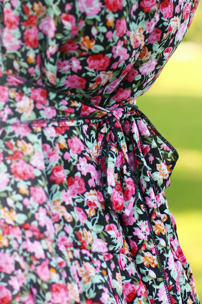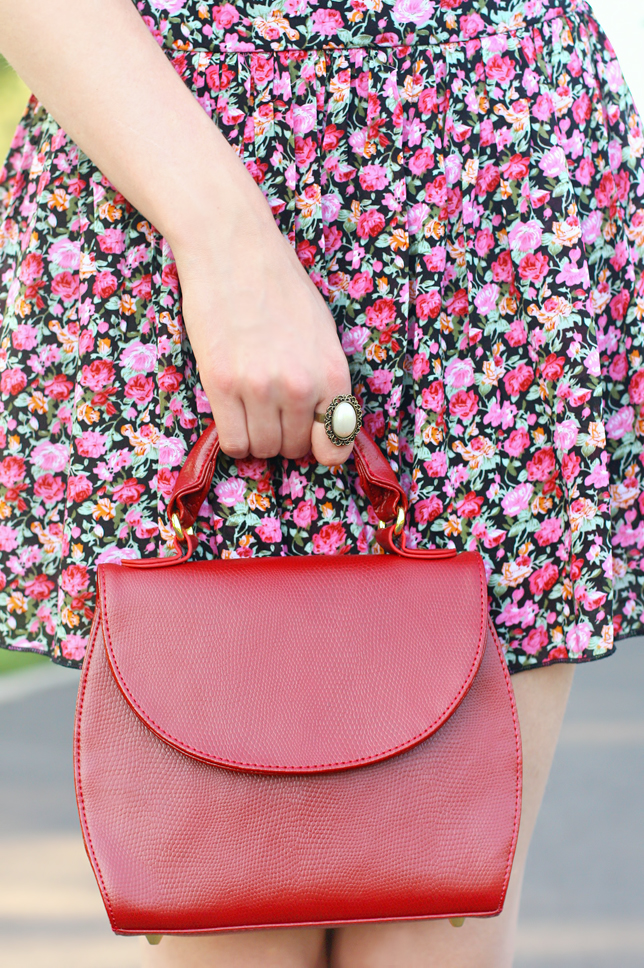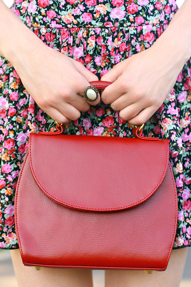 Kiedy tylko założyłam widoczną na zdjęciach kolorową zwiewną sukienkę, dopadł mnie kwiatowy zawrót głowy! ;) Bez wątpienia materiał, z którego została wykonana bardzo rzuca się w oczy. Kreację postanowiłam połączyć z elegancką skórzaną torebką w stylu retro oraz delikatną biżuterią - dzięki temu stylizacja wygląda niczym wyjęta z dawnych lat.