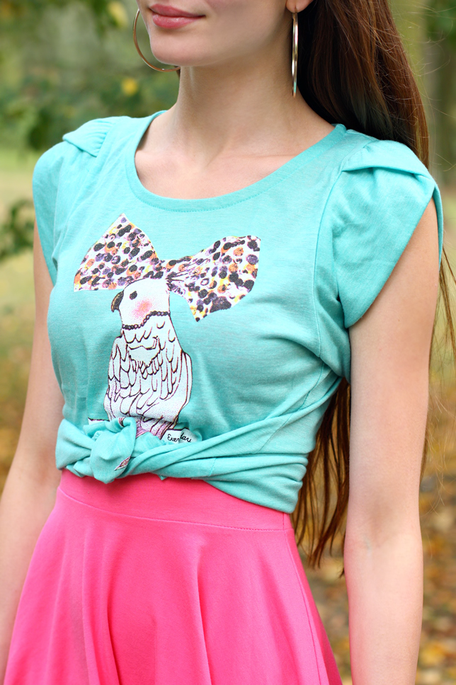Rzadko noszę T-shirty, ale ten wpadł mi w oko ze względu na uroczy nadruk i ładny wyrazisty miętowy kolor. Postanowiłam nałożyć go na rozkloszowaną sukienkę, której barwa kojarzy mi się z różową gumą balonową ;) Całość wygląda nieco zabawnie, a może nawet trochę kiczowato - sądzę, że mimo wszystko warto czasem zaszaleć z kolorami :)