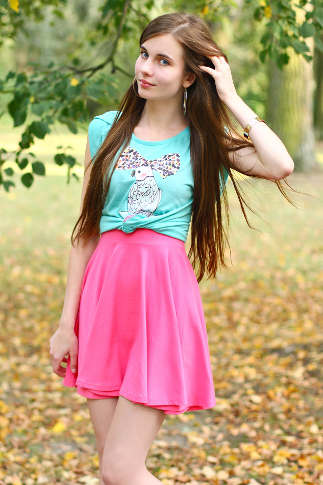 I wear T-shirts rarely, however this one from Arafeel.com caught my fancy beacuse of the printing on its and nice, expressive mint colour. I put it on a flared dress from Beckybwardrobe.com, which colour brings on my mind a bubble chewing gum. Maybe a whole outfit looks funny, or even a little tawdry, but I think sometimes it is good to do some experiments with colours! :)
