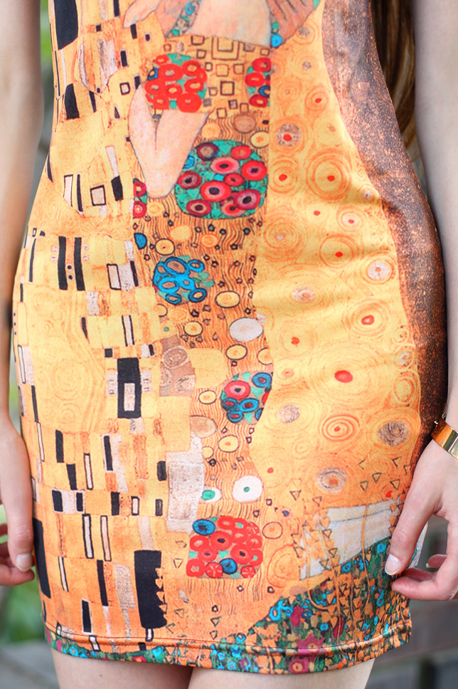 Ubrania z nadrukami przedstawiającymi prace różnych artystów cieszą się obecnie sporą popularnością. Osobiście bardzo polubiłam ten trend, więc w mojej szafie zagościło kilka tego typu "perełek" :) Wśród nich znalazła się także krótka sukienka przedstawiająca "Pocałunek", czyli jedno z najpopularniejszych dzieł Gustava Klimta. Identyczną znajdziecie <tutaj>. Bez wątpienia taka kreacja prezentuje się bardzo oryginalnie! Może niektórzy z Was wiedzą, że prawdziwy obraz został wykonany także przy użyciu płatków złota - nawiązałam do tego decydując się na dodatki w takim kolorze :)