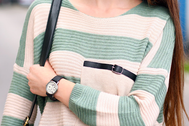 Summer is slowly ending but sometimes days are warm. While I was doing the shopping, I was wearing a loose striped green sweater from Udobuy.com - it is very comfortable and I liked it so much! ;) Thereto I added denim shorts from Bershka, gray suede bag from Vj-Style.com and a black watch from Asos.