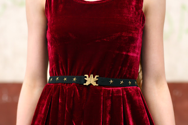 When you see velvet, what it connotes you? A beautiful party dresses? Baroque splendour? Or maybe... upholstery of elegant old furniture? I think, this kind of fabric is perfect also for casual clothes, especially for cooler weather. Velvet is warm, soft to the touch and very stylish. My burgundy dress, which I bought last summer at Romwe.com, I decided to match with fine black pantyhose, classic leather pumps and gold jewellery: earrings from H&M and oval ring from Vj-Style.com. Unfortunatelly, the dress was a little to big form my size, but thanks to this original belt with metal stars I was able to hide it. Admittedly all photos were taken in the late September, but just a few modifications let us adjust it to the winter.