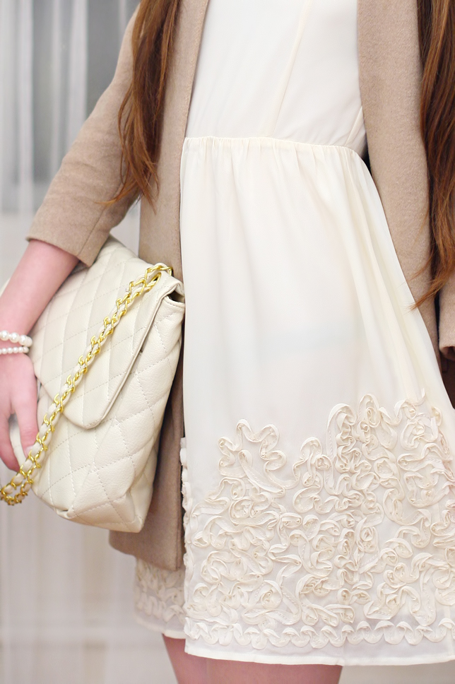 Dopiero co spadł śnieg, a ja już tęsknię za wiosną... Beżowy prosty płaszczyk z rękawami o długości 3/4 będzie niestety musiał poczekać na cieplejsze dni - jednak brzydka pogoda nie powstrzymała mnie przed sprawdzeniem z czym będzie prezentował się najładniej :) Przyznam, że od dłuższego czasu poszukiwałam takiego minimalistycznego, eleganckiego fasonu - ostatecznie zdecydowałam się na model dostępny <tutaj>. Dobrałam do niego delikatną kremową sukienkę z oryginalnie zdobionym dołem, cieliste czółenka na bardzo wysokim obcasie oraz pikowaną jasną torebkę. Całość wygląda dziewczęco i elegancko - czyli tak jak lubię ;)