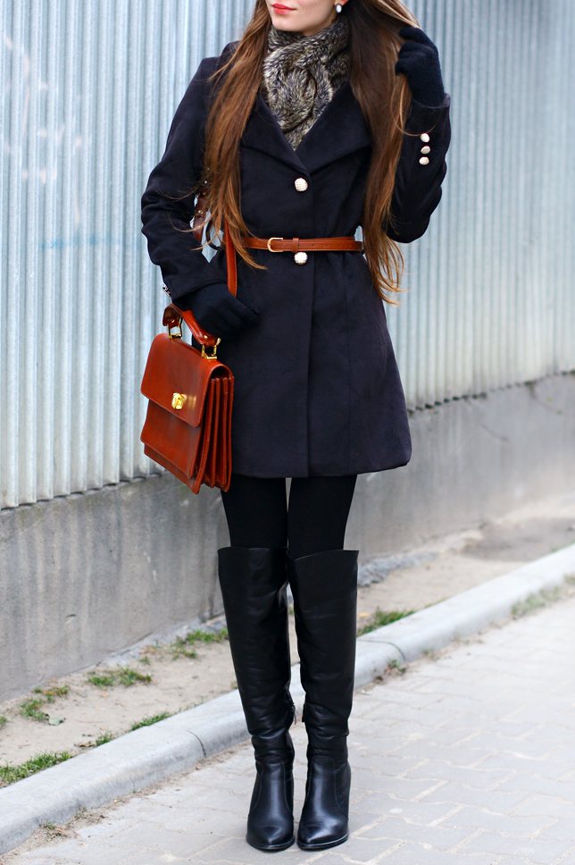 Lately a few people ask me to show any winter kits. I had thought 'ok!' and prepared some. First of them will be in elegant version. Black coats are simply classic - you could match them almost with eveything, and always it looks very nobbily. I have a few and this one is just either of many in my wardrobe. It comes from Indressme.com. Especially I like its soft fabric and plain, but feminine fashion. I took a brown belt instead of the belt that was attached to the coat. It makes figure looks fine. This year I have fallen in love with all kinds of fur accesorries - one of them is this fur scarf. I don't like to feel cold and freeze, so I put warm leather jackboots with heels, which I bought over two years ago. They are really comfortable, but now I regret I haven't decided on more fitted model. Thereto I added leather bag from Asos and black bow watch from Accessorize.