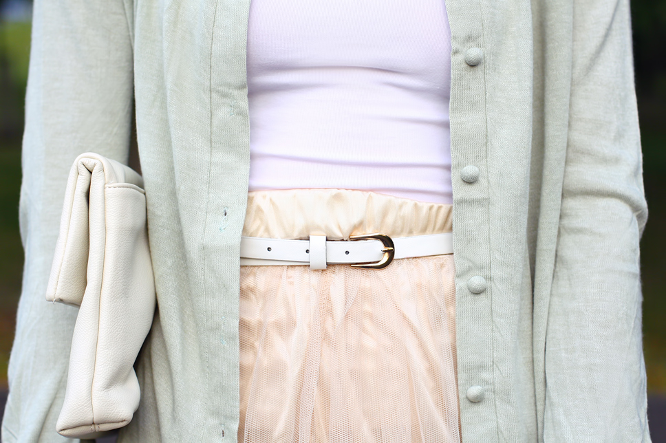 Kolejna porcja "starych" zdjęć - tym razem z końca września. Miętowy luźny cardigan to jeden z moich ulubionych sweterków - bardzo lubię tego typu urocze ubrania! ;) Dodałam do niego gładki biały top i tiulową kremową spódniczkę, która idealnie zgrała się z koronkowym kołnierzykiem. Dopasowane dodatki: jasna kopertówka, złote kolczyki oraz biały pasek nadały stylizacji dziewczęcego charakteru, natomiast cieliste szpilki wydłużyły optycznie nogi :)