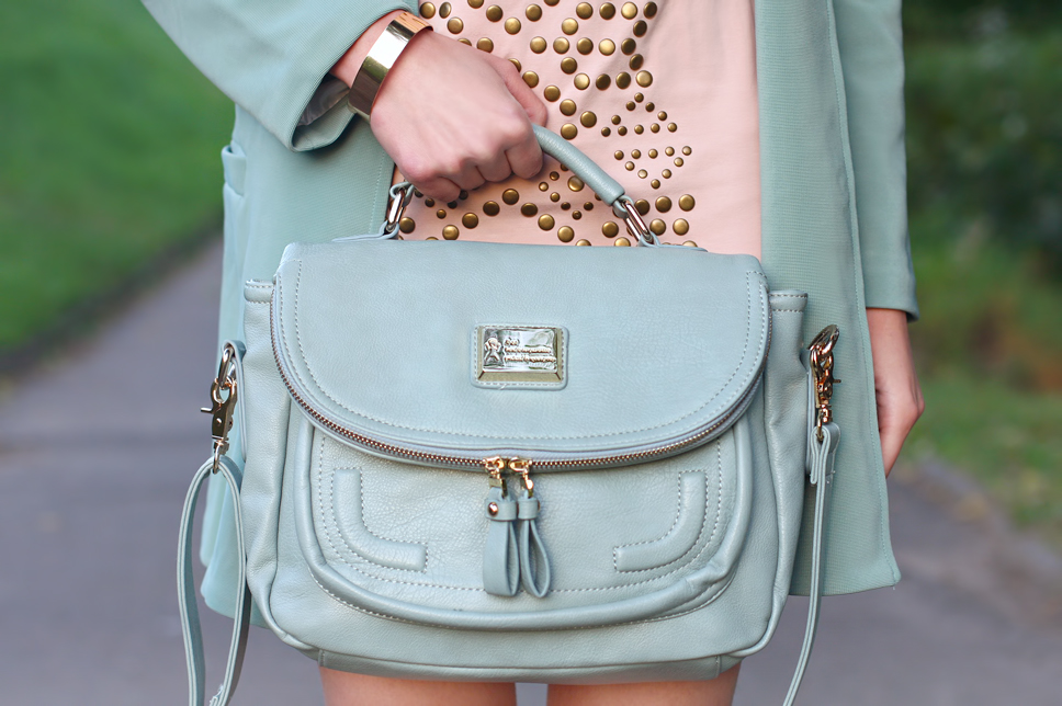 This time I'm going to show you my pastel outfit which I wore it in August. The beige, studded dress from AxParis.co.uk I set with a loose mint blazer. Thereto I added matching accessories - bright leather high heels from Asos, an elegant blue bag from Romwe.com and gold jewelry