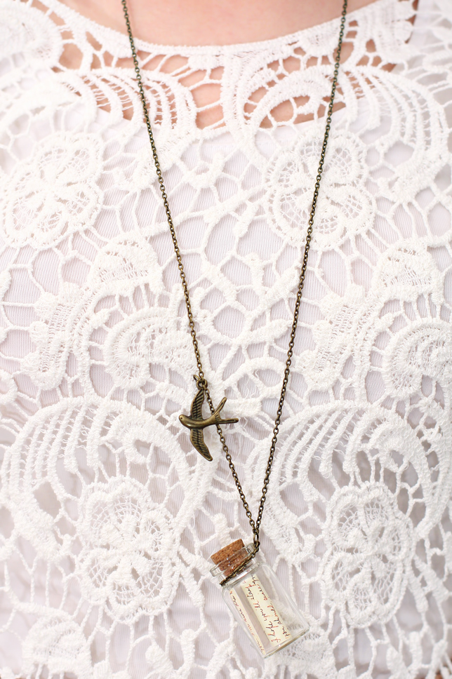 Although spring has just started, I already know that this season (of course, when it heats up) I will often wear pastel ,girly' outfits. This white lacy top have stack up in my closet for a long time - I really did not know what could I wear it with... However, recently I tempted to put on me a delicate peach skirt from Chicwish.com , and they both created a pretty nice couple ;) But it was a little bland, so I broke the boredom using the green bag in retro style from Vj-style.com, I decided also to choose an original hand-made pendant in the form of a small bottle with a letter inside - I like that kind of little "marvels" :)
