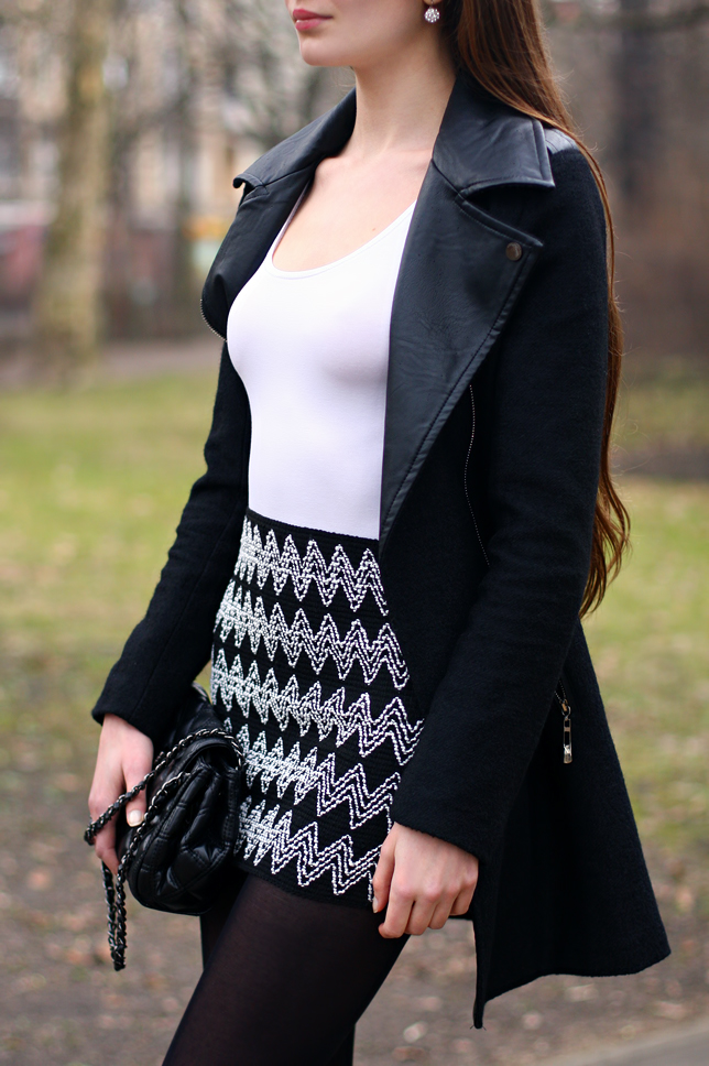 Finally, spring has arrived! ;) The elegant black coat with leather lapels from Sheinside.com certainly will often be part of my daily outfits. This time, I set it with a white top from H&M and an original two-color skirt from <here> - as you know, a combination of white and black is one of my favorite duets. Small quilted chain bag from Arafeel.com and black pointed toe heels from Vivilli.com completed this outfit.