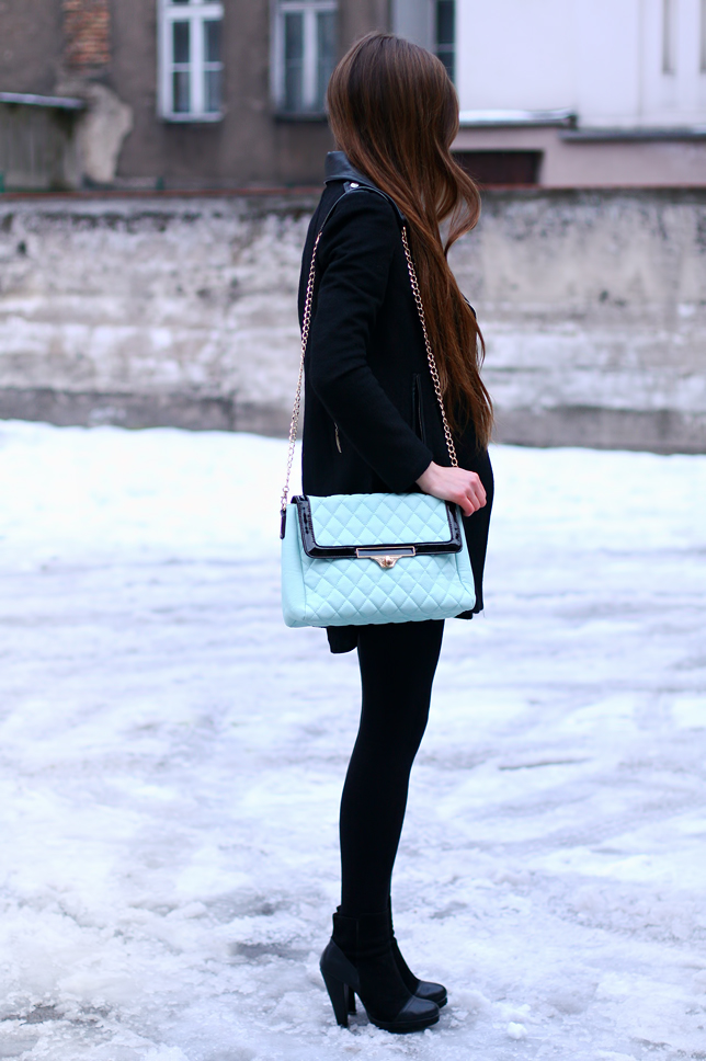 It is hard to believe that these pictures was taken yesterday... I have been thinking about this spring outfit for a long time - and I have been waiting patiently for the appropriate weather to prepare a few shots for you... But I have't waited untill now. I know that this type of dress looks a bit strange with the snow in the background, but I had no choice because the Spring hasn't wanted to start in Poland so far... I combined an elegant black coat from Sheinside.com with a neon pink dress from Asos, which brightened the dark of the whole outfit :) Another colourful element that I decided to choose, but also more subdued, is a mint quilted bag from one of my favorite online stores - Chicwish.com. Thereto I added suede boots from Vivilli.com.