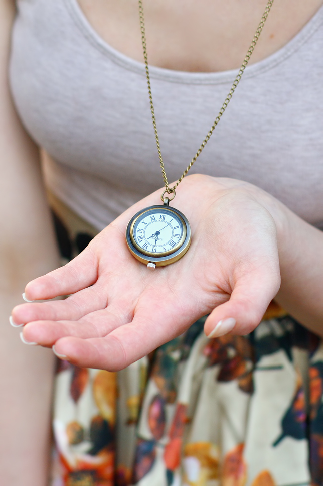The weather is very beautiful, so I prepared for you many photos :) Some time ago I mentioned that I love painting prints in fashion - recently I bought two artistic items: a beautiful flared floral skirt from ChicNova.com and a watch necklace with decorated back from BangGood.com. Have you ever seen these angels? If you like Renaissance art, you certainly know that these cherubs were painted by Italian artist - Raphael Santi. Other elements of this outfit were a brown vintage handbag from Udobuy.com and a red ring from Ecugo.com.