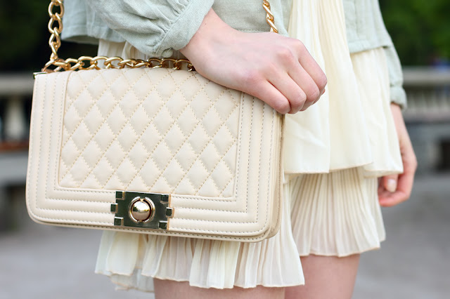 Mięta i jasny beż tworzą niezwykle delikatny duet barw, który bardzo przypadł mi do gustu. Pistacjowy cardigan - jak już wiecie - jest moim ulubieńcem! ;) Tym razem połączyłam go z kremową dziewczęcą sukienką o oryginalnym fasonie - jej góra jest ozdobiona piękną koronką, natomiast dół składa się z dwóch plisowanych warstw. Do tego dodałam pikowaną torebkę na łańcuszku oraz skórzane czółenka na wysokim obcasie.