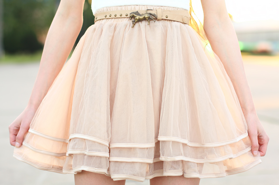 Kolejna stylizacja z białym koronkowym braletem - tym razem bardzo dziewczęca :) Po dodaniu do niego beżowej rozkloszowanej spódniczki z tiulu całość wygląda niczym zwiewna sukienka! Talię podkreśliłam dość oryginalnym paskiem, który kupiłam kilka miesięcy temu w Reporterze - w oko wpadła mi przeurocza klamra w kształcie... konia ;)