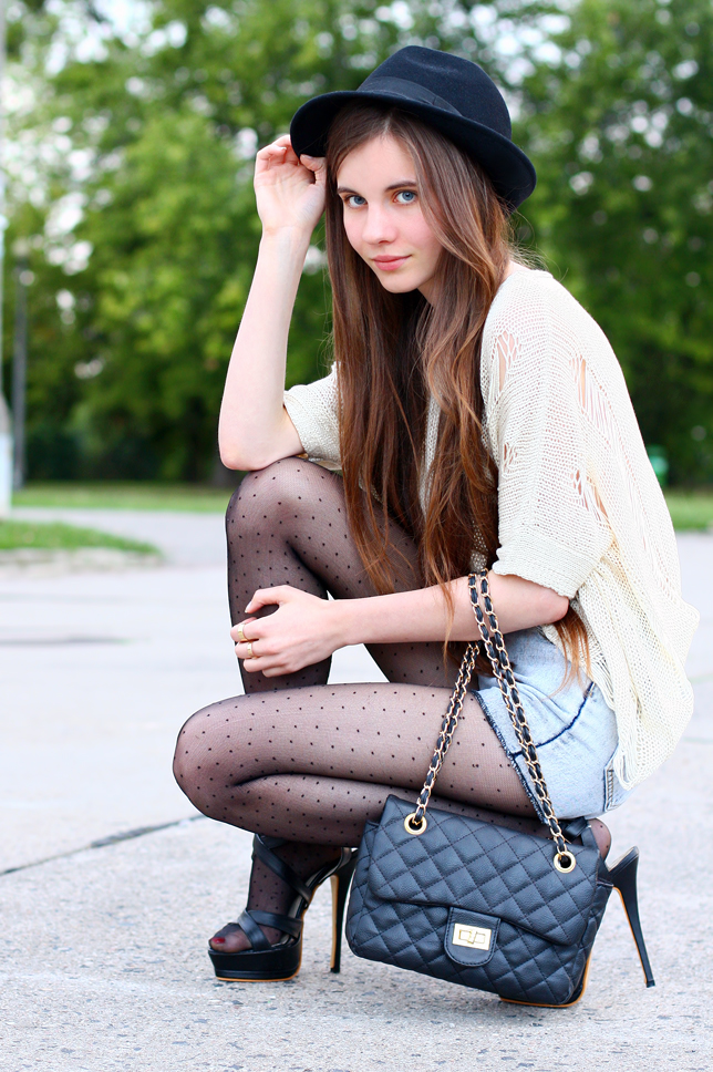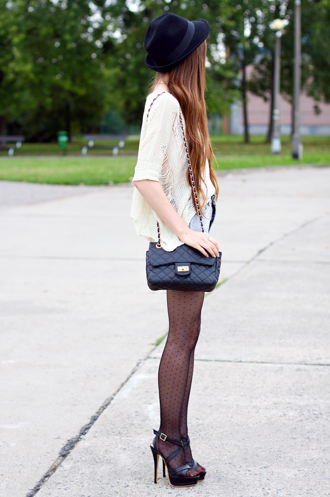 Tights and sandals usually aren't good combo... Although it has many detractors, I think that in some cases you can afford it - so I combined black dot tights with black shoes on a high heel from MartOfChina.com. What do you think about it? Thereto I added a few contrasting elements such as loose cream sweater, high-waisted denim shorts from Romwe.com, an elegant classic quilted bag from Arafeel.com and a black hat.