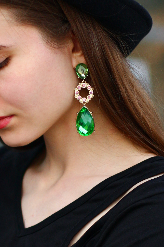 Pamiętam kiedy w 2009 roku zakochałam się w szmaragdowych zjawiskowych kolczykach, które Angelina Jolie miała na sobie na oskarowej gali. Co prawda od tego czasu minęło już wiele lat, ale ja wciąż rozglądałam się za podobnymi okazami - aż trafiłam na te, które możecie zobaczyć poniżej :) Przyznam, że rozważam odpięcie znajdującego się po środku kółka - wtedy kolczyki wyglądałyby niemal identycznie jak te, które nosiła aktorka. Myślicie, że to dobry pomysł? Ponieważ zdecydowałam się na wyrazistą biżuterię, zrezygnowałam ze zbyt wyszukanych ubrań i dodatków. Założyłam jedynie czarną, asymetryczną sukienkę, klasyczny kapelusz oraz lakierowane czółenka, które ostatnio bardzo polubiłam ;)