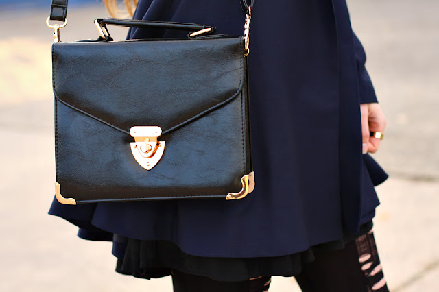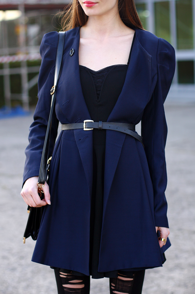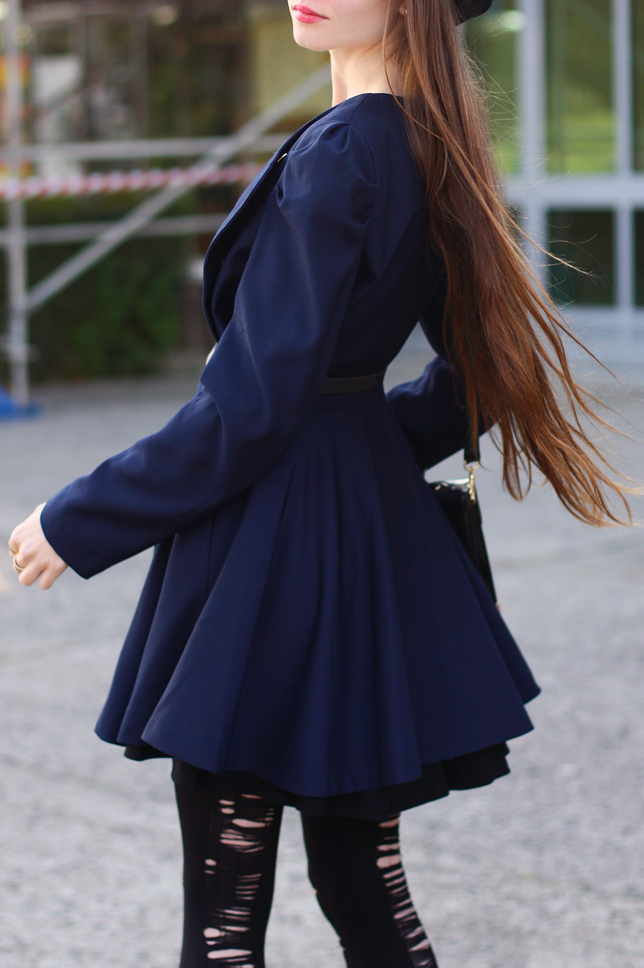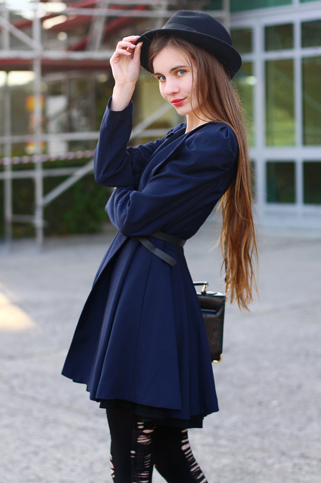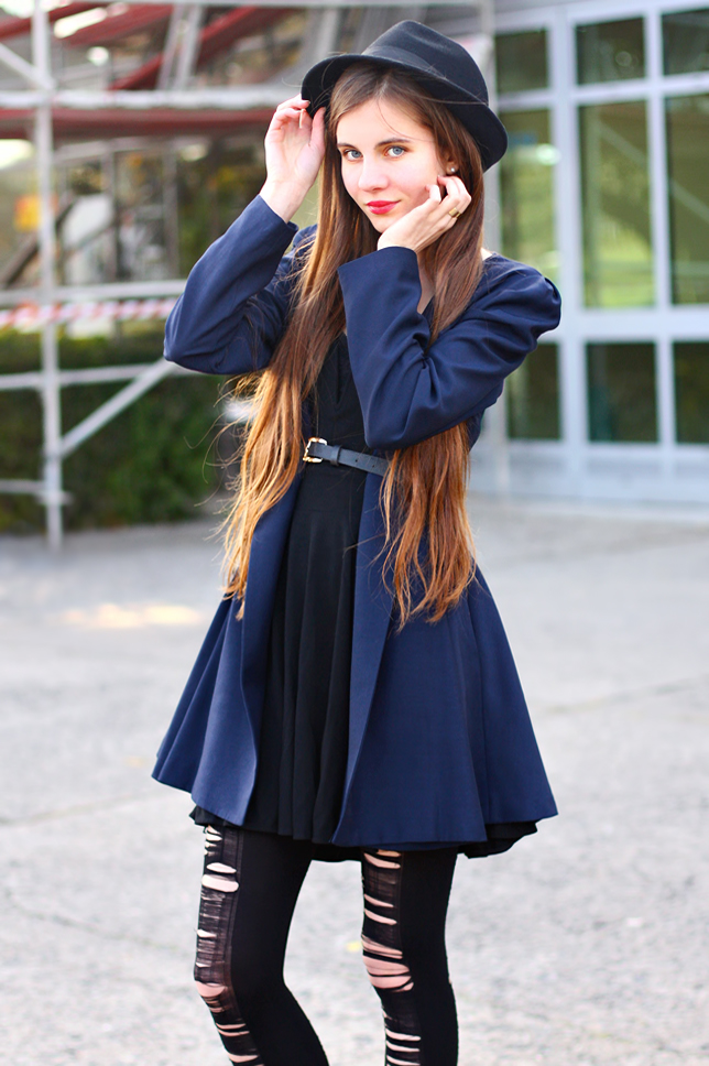 Co prawda nie obchodzę Halloween, ale dziurawe rajstopy, które możecie zobaczyć poniżej byłyby wg mnie świetnym elementem jakiejś "strasznej" stylizacji. Ja zestawiłam je jednak z rozkloszowanym granatowym płaszczem, dopasowaną sukienką oraz czarnym kapeluszem - taki kontrast pomiędzy elegancką górą i niedbałym dołem wygląda całkiem interesująco! :)