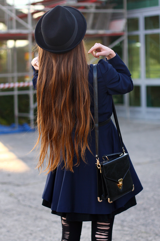 Tights with holes from FrontRowShop.com that you can see below in my opinion would be a great element of the scary Halloween costume. I set them with a flared blue coat from Romwe.com, a black dress from TFNC London and a classic hat - the contrast between the elegant top and the destroyed tights looks very interesting! :)