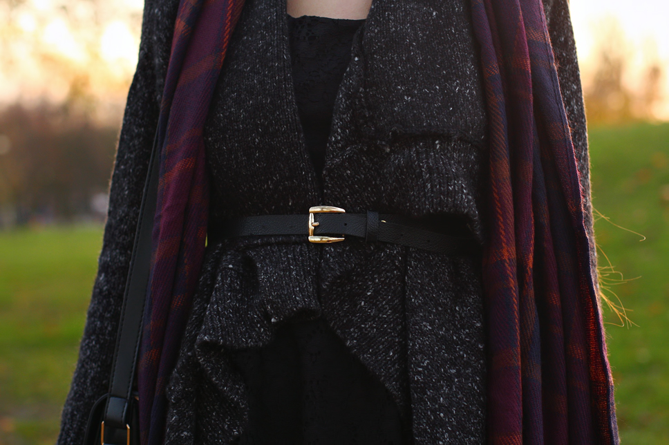 A dark grey loose cardigan from Romwe.com, a plaid purple scarf from PersunMall.com and a black hat - these items are perfect to wear in autumn. Surely you see them on my blog many times! ;) Thanks to a lace dress from WalG and comfortable leather pumps from Aldo, my outfit looks more feminine. I decided to add thereto a black postman bag from Ecugo.com - it is simple and very elegant.