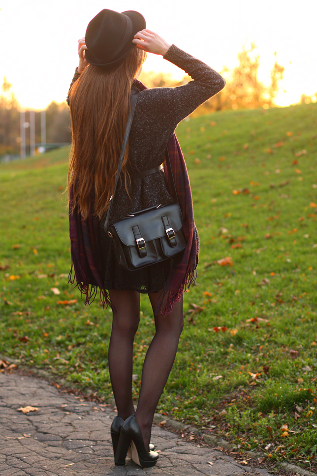 Ciepły luźny sweter, długi szal w kratę oraz klasyczny kapelusz - wszystkie te elementy są wręcz stworzone do noszenia w chłodne, jesienne dni. Z pewnością zobaczycie je na moim blogu jeszcze wiele razy! ;) Dzięki zestawieniu ich z koronkową sukienką oraz wygodnymi czółenkami na masywnym obcasie, stylizacja nabrała bardziej kobiecego charakteru. Zdecydowałam się także na dodatek w postaci czarnej torby listonoszki - przyznam, że szukałam takiego prostego, eleganckiego modelu już od dawna.
