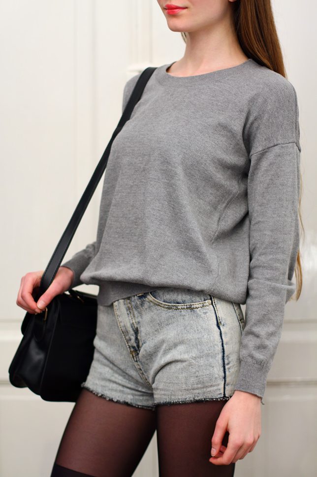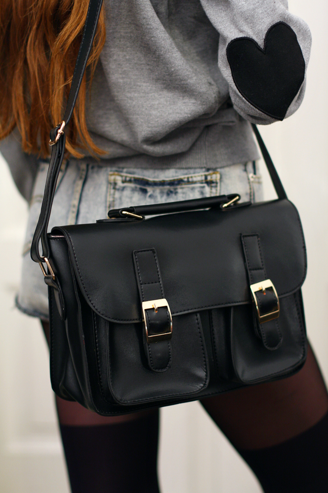 Pewnie pamiętacie, że w zeszłym roku sporą popularnością cieszyły się ubrania z naszytymi na łokciach łatami. Nie posiadałam do tej pory żadnej takiej rzeczy, aż trafiłam jakiś czas temu <tutaj> na pozornie zwyczajny, szary sweter. Okazał się jednak wyjątkowy dzięki znajdujących się na rękawach czarnym sercom, które bardzo mnie urzekły :) Dodałam do niego jeansowe szorty, torbę listonoszkę i rajstopy, które przypominają zakolanówki.