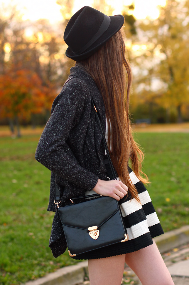 Poniższe zdjęcia przygotowałam niecałe dwa miesiące temu - teraz nawet mi jest ciężko uwierzyć, że pod koniec października była aż tak ładna pogoda! ;) Szary asymetryczny cardigan to jedna z moich ulubionych rzeczy, które nabyłam jesienią - jest ciepły, wygodny i pasuje do niemal wszystkiego. Poniżej możecie zobaczyć, jak prezentuje się w towarzystwie białego gorsetowego topu oraz rozkloszowanej spódniczki w paski.