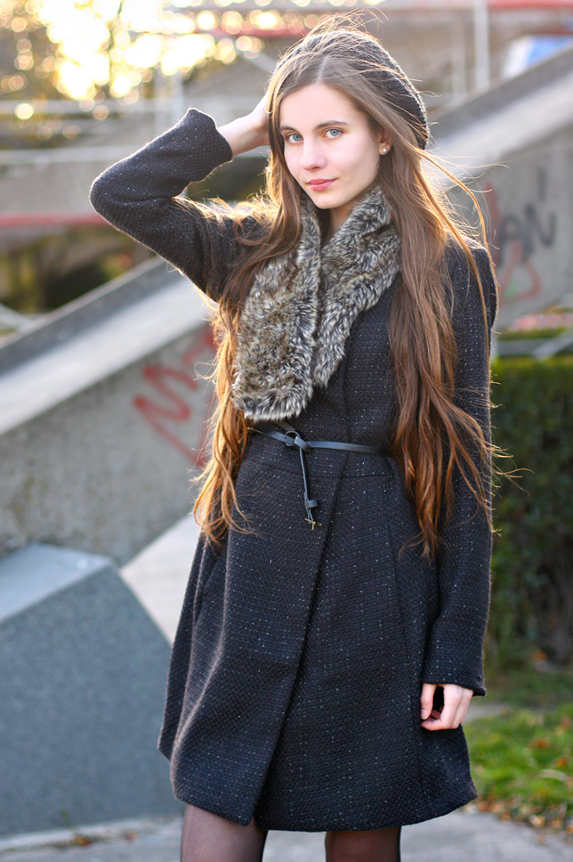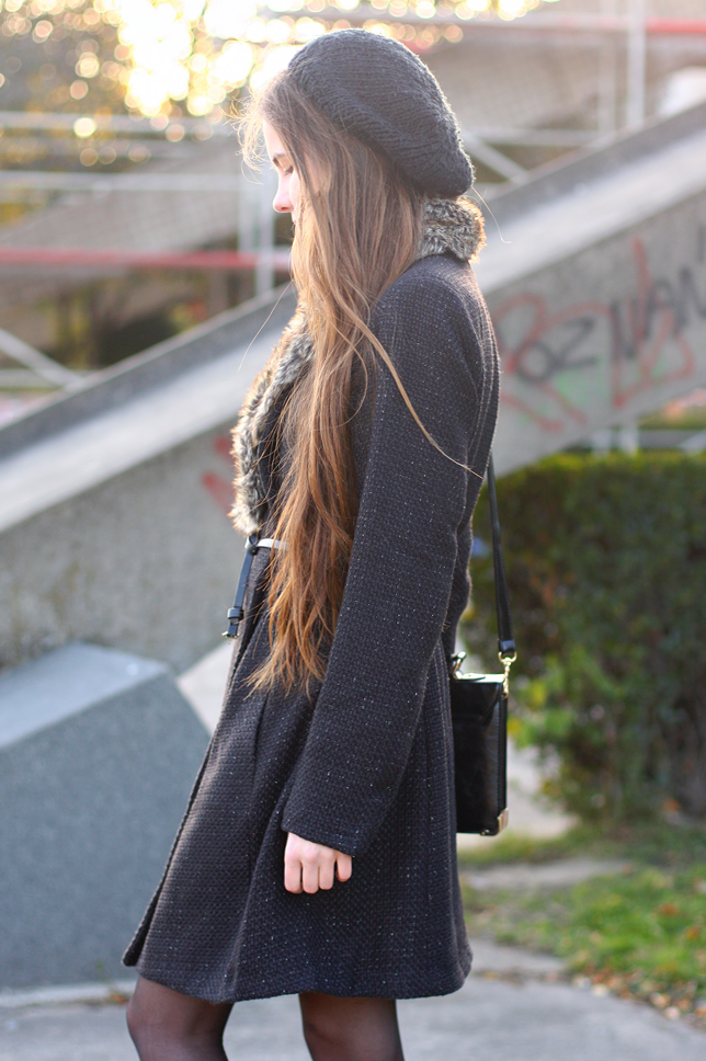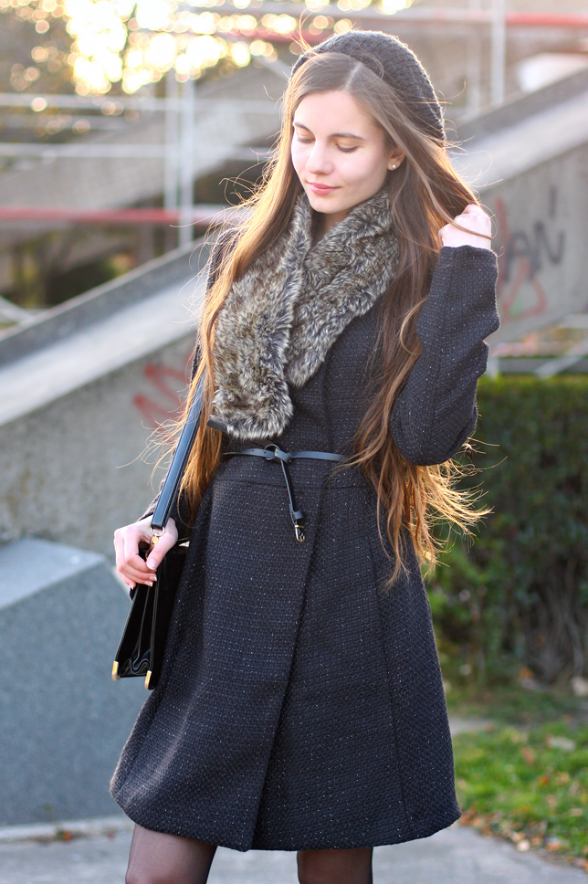 I love elegant outfits, but in winter I usually wear comfortable and warm clothes... but now I decided to share with you my chic look - sometimes there are situations when you have to wear a coat and pumps instead of a warm jacket and boots. I bought this pretty coat at Sheinside.com. Thereto I added feminine accessories: a small bag from RoseWholesale.com, black heels from PersunMall.com, seamed tights and a faux fur scarf from Cropp Town.