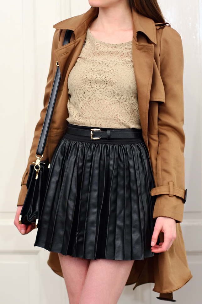 An elegant camel trench coat from Arafeel.com, which you can see below, have to wait in my closet until the spring, but I wanted to show it you! :) This coat looks great with a beige lace top from 2dayslook.com and a pleated leather skirt from Romwe.com. Thereto I added a small black handbag from RoseWholesale.com.