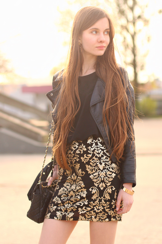 Sukienki wyszywane cekinami mogą prezentować się naprawdę elegancko. Ta widoczna poniżej na pierwszy rzut oka przypomina komplet składający się ze zwiewnej czarnej bluzki i wzorzystej krótkiej spódniczki. Uwielbiam barokowe motywy w modzie, więc od razu wpadła mi w oko ;) Dodałam do niej ramoneskę, szpilki i pikowaną torebkę.