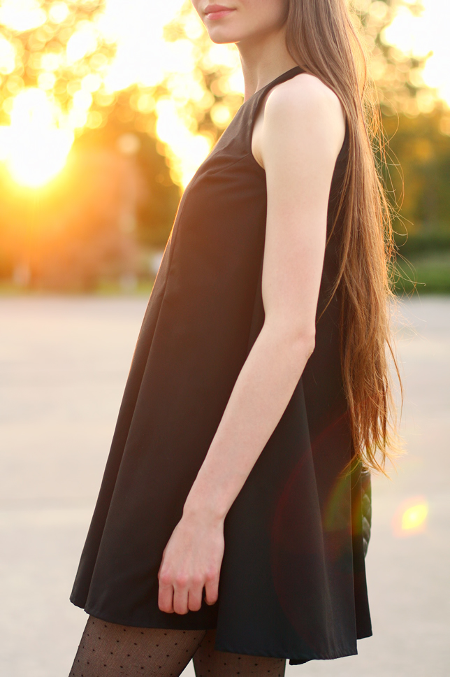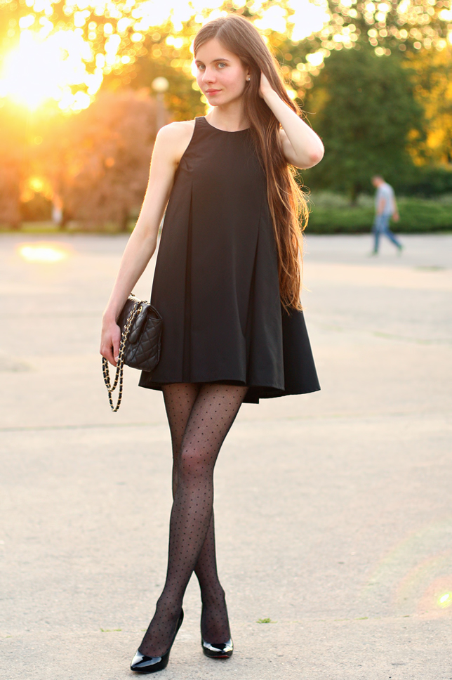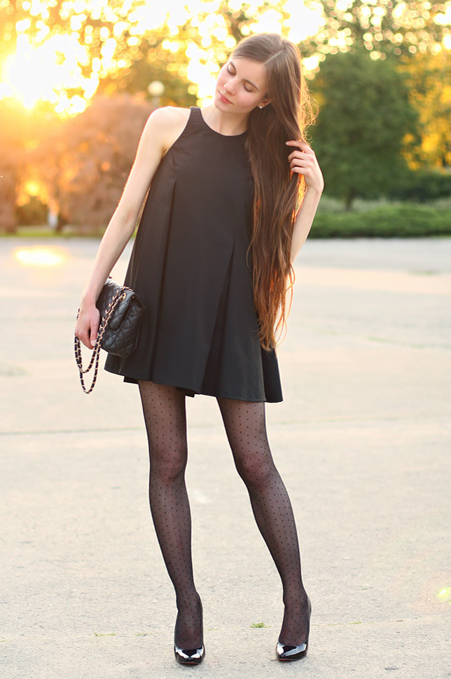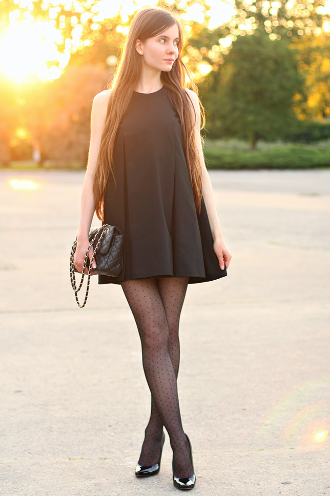 Recently I showed you a few pastel outfits, so today I have for you a set consisting of black components only. A simple dress which look like a trapezoid from LetThemStare.com exposes my legs ;) I set it with polka dot tights, lacquered heels from PersunMall.com and a quilted handbag.