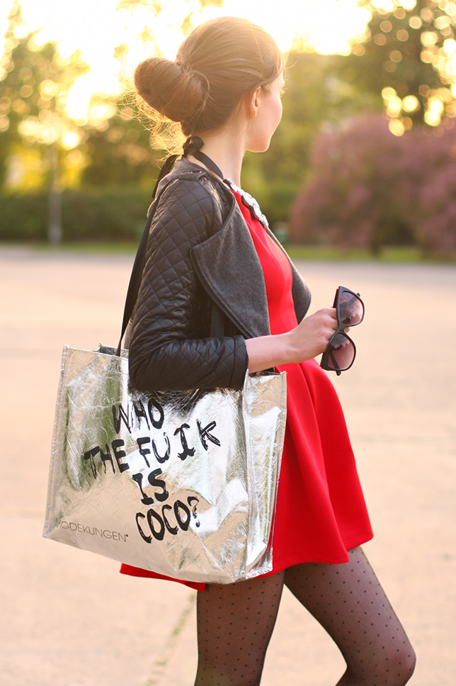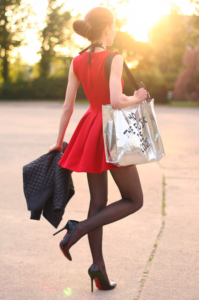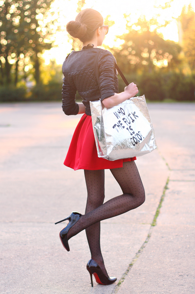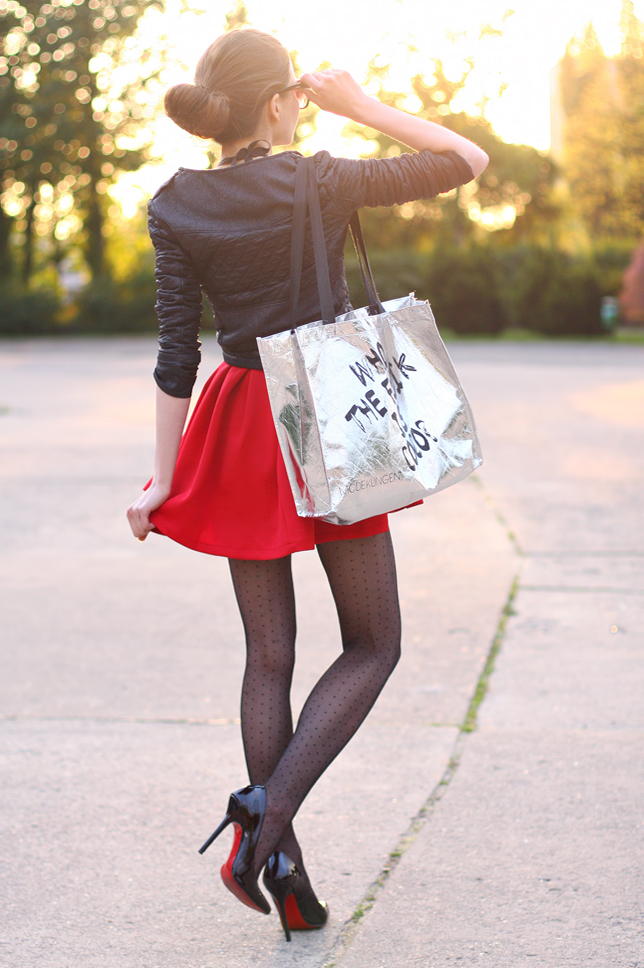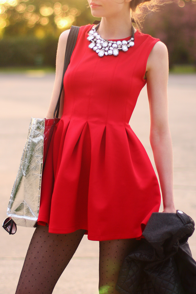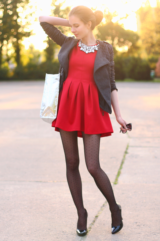 A few days ago I showed you outfit in red, today I have for you my next red look because I really like this extremely feminine color :) This time I wore a mini cheap dress from LovelyShoes.net which looks very pretty. I like most the flared bottom! I added thereto a quilted gray jacket from Sheinside.com, a crystal necklace from Choies.com and black dot tights. Instead of an elegant clutch, I chose a silver shopping bag with funny text, which I got as a gift to order at Modekungen.com.