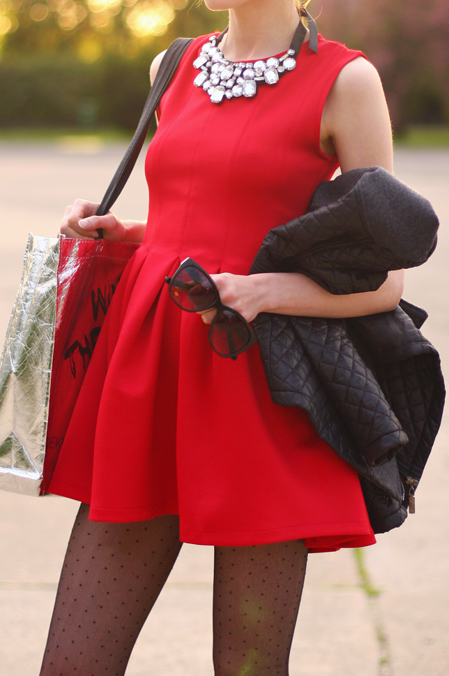 Kilka dni temu pokazywałam Wam stylizację w czerwieni, a już dziś mam dla Was kolejny zestaw z tym niezwykle kobiecym kolorze w roli głównej :) Tym razem mam na sobie krótką sukienkę ze sklepu LovelyShoes.net, która mimo niskiej ceny okazała się wyjątkowo udanym nabytkiem. Najbardziej podoba mi się jej rozkloszowany dół, który świetnie podkreśla figurę. Ponieważ było chłodno, narzuciłam na siebie pikowaną szarą kurtkę, a na nogi założyłam czarne rajstopy w kropki. Zamiast eleganckiej kopertówki, zdecydowałam się na zabranie ze sobą dużej srebrnej torby na zakupy z zabawnym napisem, chociaż zdaję sobie sprawę, że taki dodatek nie wszystkim przypadnie do gustu... ;) Dostałam ją jako gratis do zamówienia w jednym z internetowych sklepów.