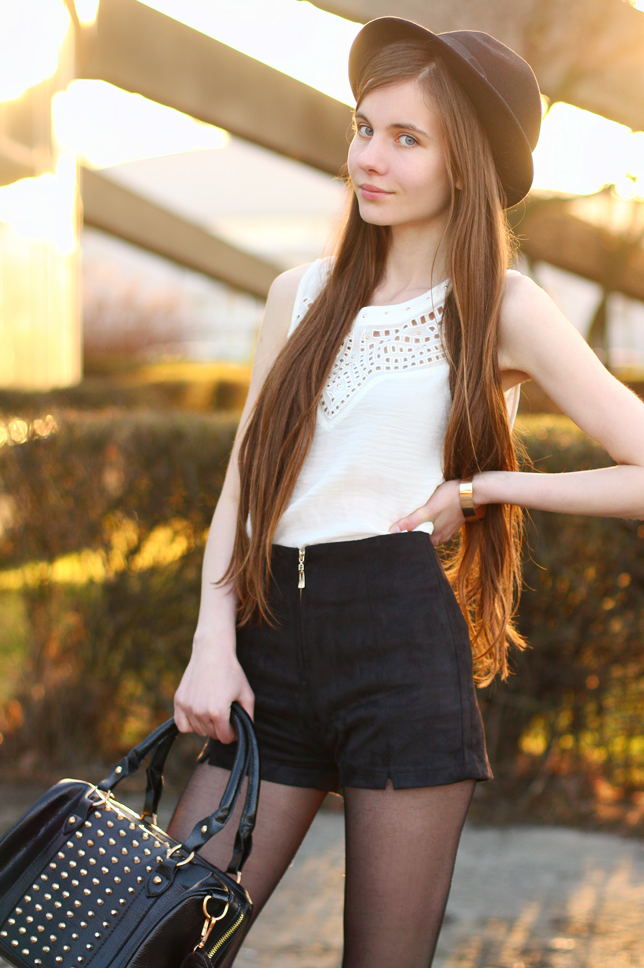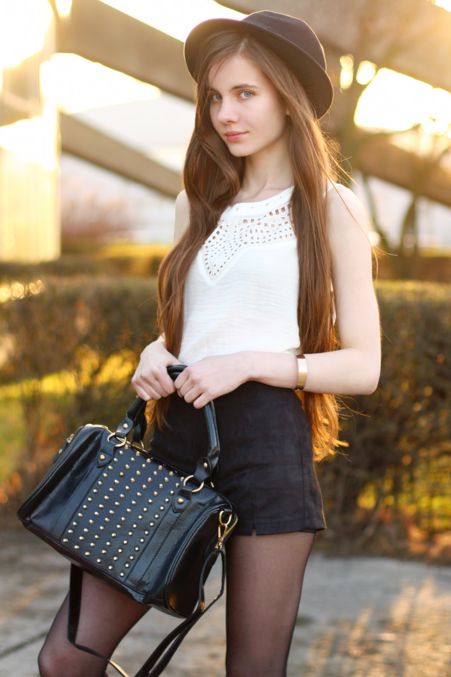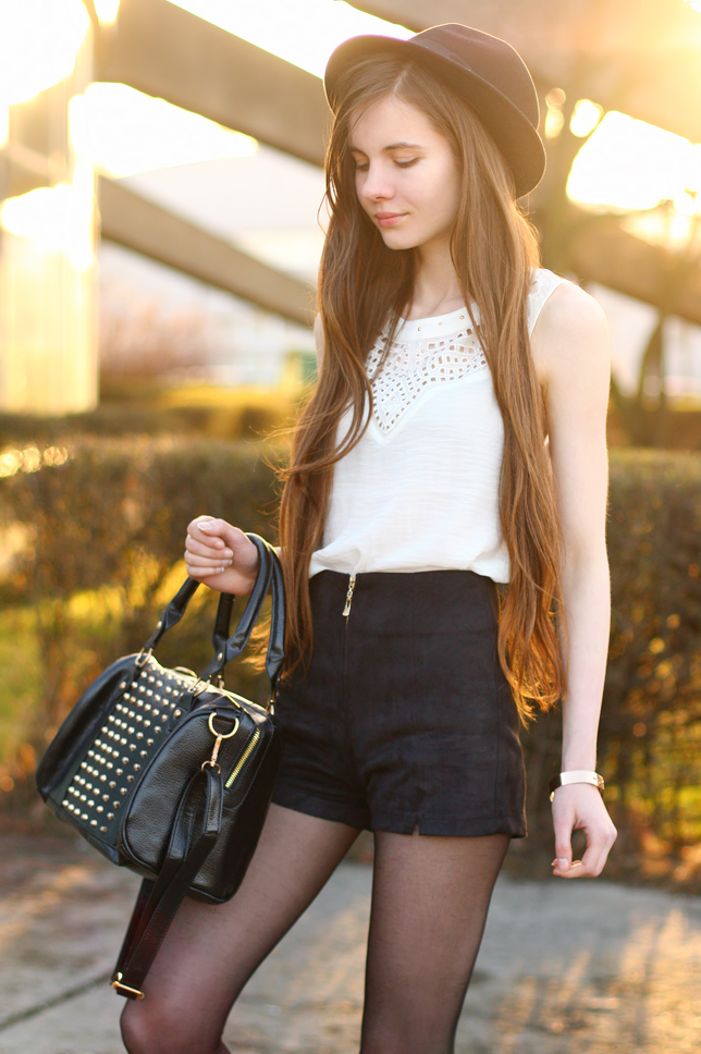 Recently the weather isn't nice, so I have some old photos for you :) Can you believe that these pictures were taken two months ago? Black and white is a simply and classic duo - It looks great with a touch of gold. This outfit is very comfortable and practical - a white loose top from BlackFive.com, suede shorts from Romwe.com and chelsea boots from Chicwish.com are great for wearing in warmer weather. Thereto I added a studded bag from Modekungen.com.