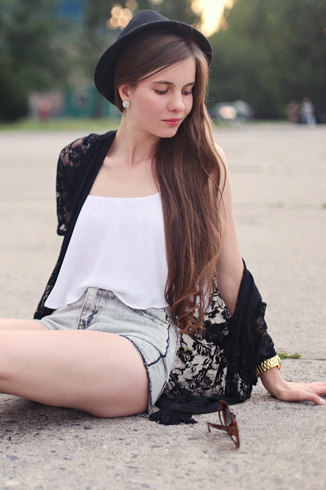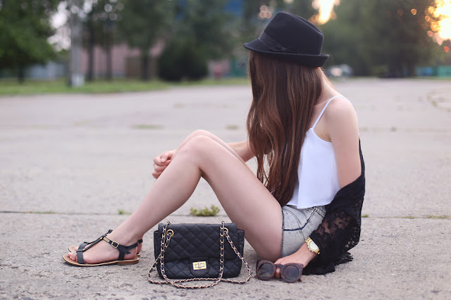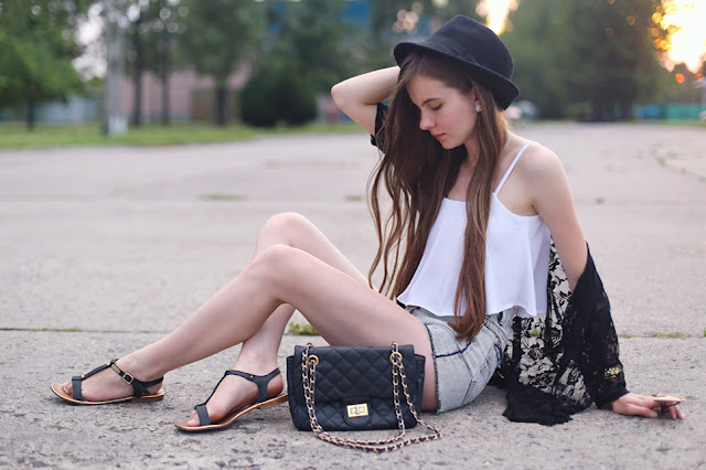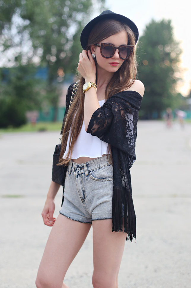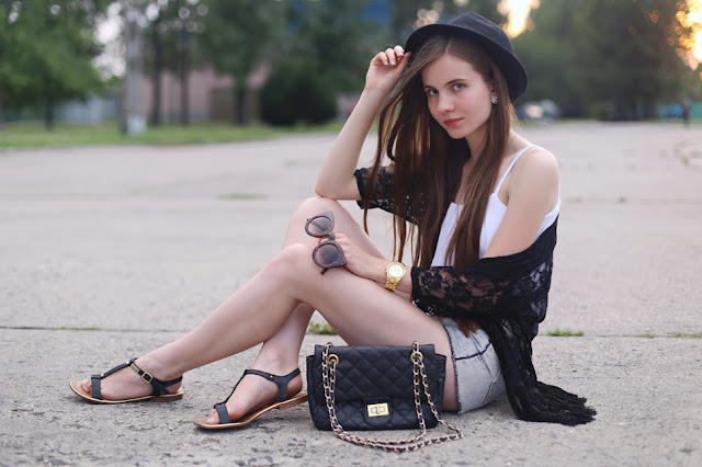 Kimono cardigans are very trendy! I'm happy because I like this style. This one which you can see on my photos, I bought at Choies.com - I like the black lace fabric and fringe. I decided to set this cardigan with simple elements: denim shorts from Romwe.com, a white crop top from Bershka, comfortable sandals and big cat-eye sunglasses from GiantVintage.com.
