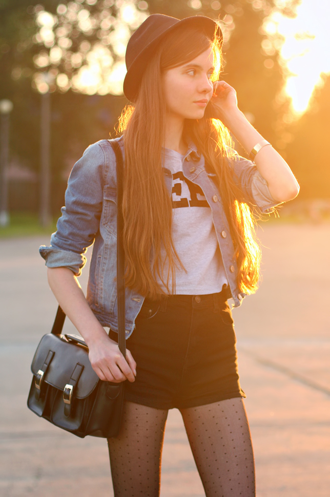 Today I have for you my third outfit with black high-waisted shorts. Such a pants looks cool with a grey T-shirt from Romwe.com, a denim jacket from Sheinside.com and dot tights. I decided to add thereto suede black heeled boots from Modekungen.com , which are quite comfortable.