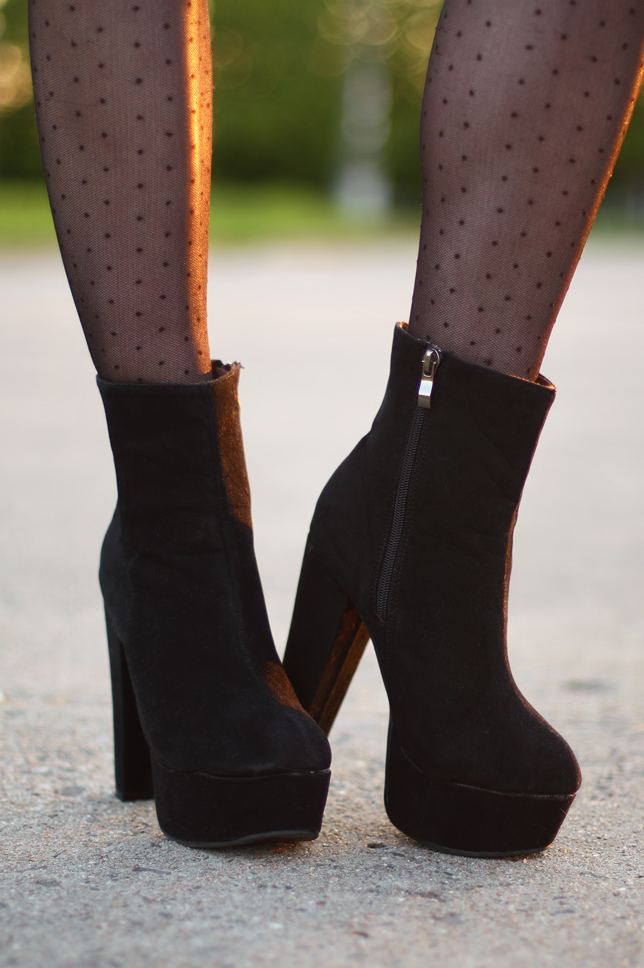 Dziś mam dla Was już trzecią z rzędu stylizację w czarnych szortach z wysokim stanem, które po prostu uwielbiam! Tym razem dodałam do nich szary T-shirt z napisem, jeansową kurtkę oraz cienkie rajstopy w kropki. Zdecydowałam się także na zamszowe botki na bardzo wysokim obcasie, które wbrew pozorom są całkiem wygodne.