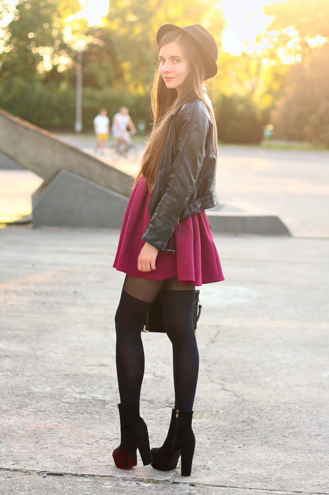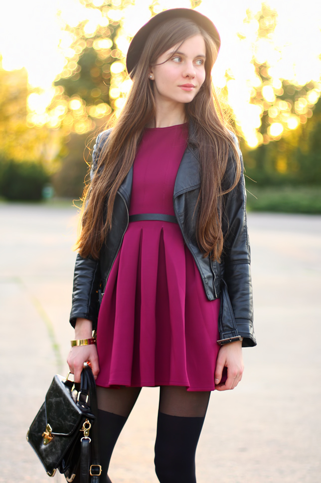 Today was a really hot day, but a few days ago when I prepared those photos the weather was a little cold... This flared dress you could already see on my blog in the red and blue colors - but I liked it so much so I decided to buy similar one in another color at Chicwish.com. I set it with my favorite leather jacket, black over knee socks and suede high-heeled boots from Modekungen.com.