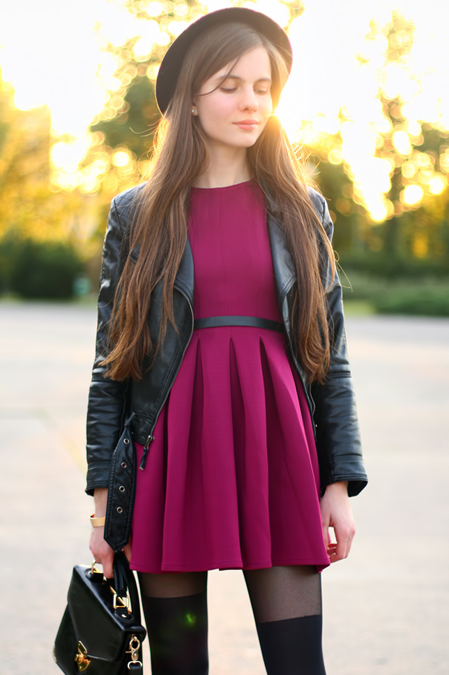 Dziś co prawda było naprawdę gorąco, ale jeszcze parę dni temu pogoda była iście jesienna - stąd ten ciepły zestaw ;) Poniższą sukienkę mogliście oglądać już na blogu w wersji czerwonej i niebieskiej - spodobała mi się jednak tak bardzo, że zdecydowałam się na kolejny kolor, tym razem burgund. Zestawiłam ją z ulubioną ramoneską, rajstopami, które wyglądają niczym zakolanówki oraz zamszowymi botkami na wysokim obcasie.
